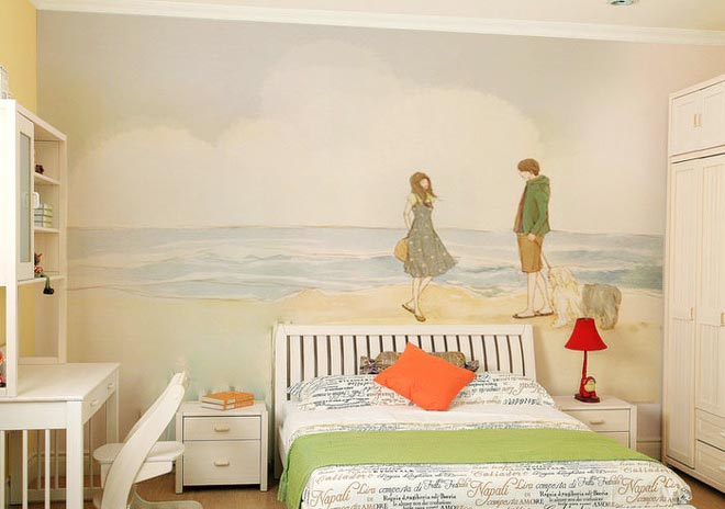 卧室,作为休息睡眠的地方,墙绘适合温馨淡雅的风格,颜色不要太艳,整体轻松愉悦才好。
