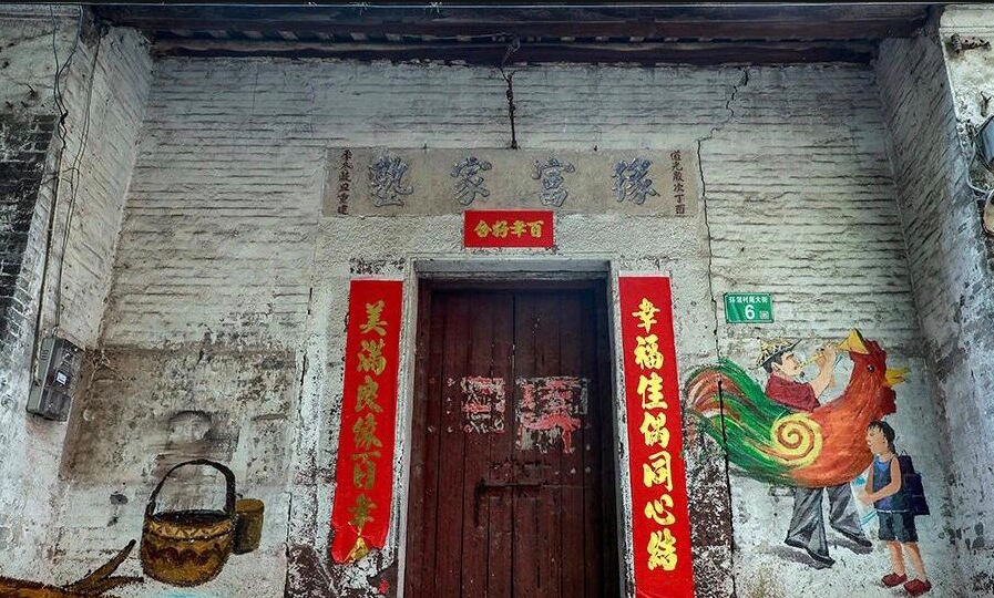 经过微改建,这栋古建筑再次容光焕发勃勃生机。本来残旧的窗门和墙面都得到了修补,墙面上空出了扒龙舟、磨刀工、理发工、编筐老人家、鸡公榄等传统老广民俗风情形象。