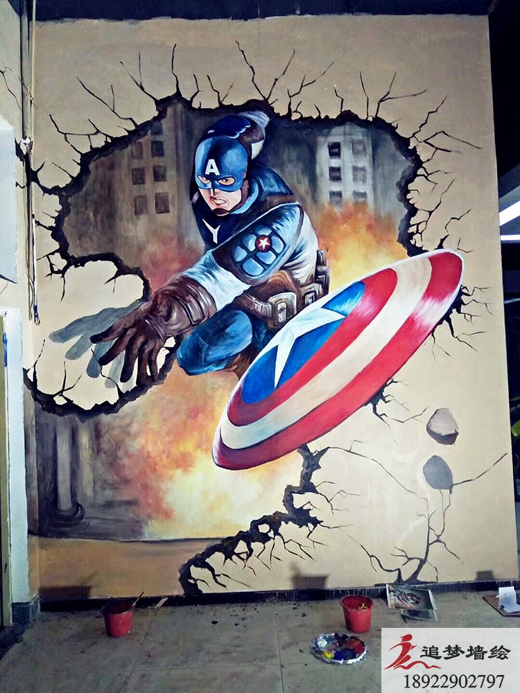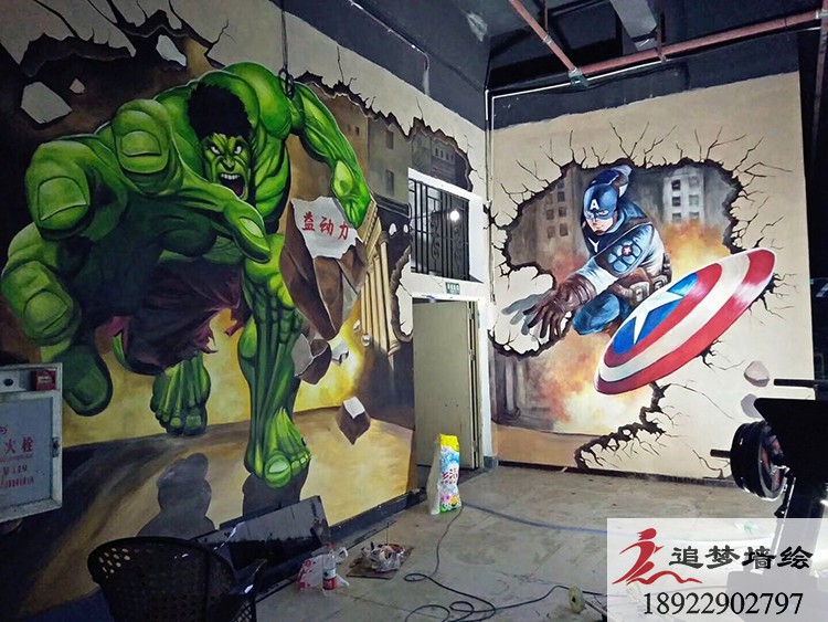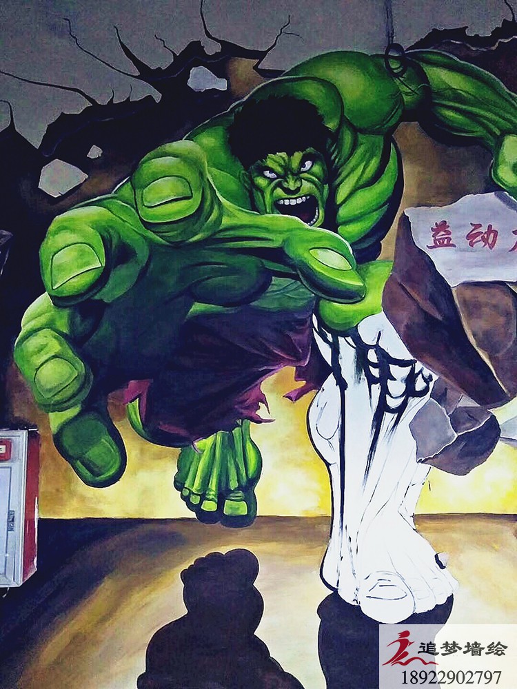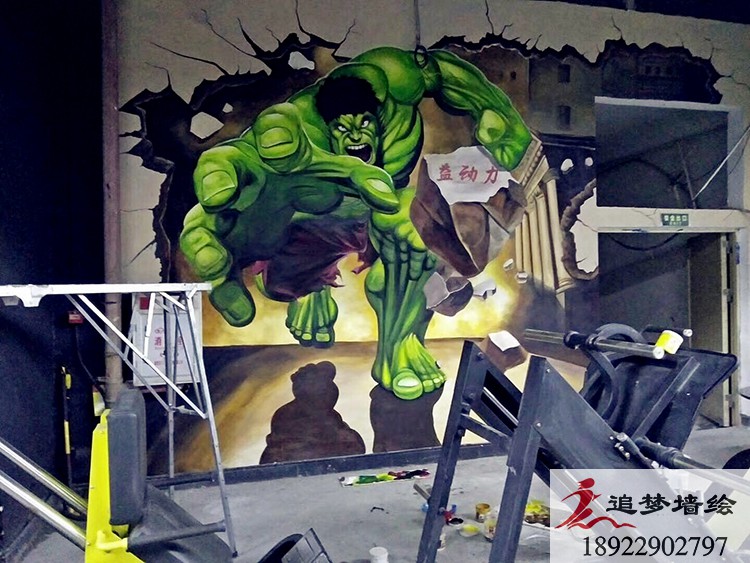 墙绘项目介绍:健身房老板在之前看到我们在02健身房做涂鸦是不错,了解到墙体彩绘价格实惠,之后叫我们这边出了绿巨人设计方案,发给老板看了之后对彩绘的认可。从样稿确定到全面设计再到施工完成,得到了老板的极大支持和赞成。该套设计方案主要采用绿巨人破墙而出,寓意我们在健身房锻炼后,能有向绿巨人一样凶猛,肌肉感极强。