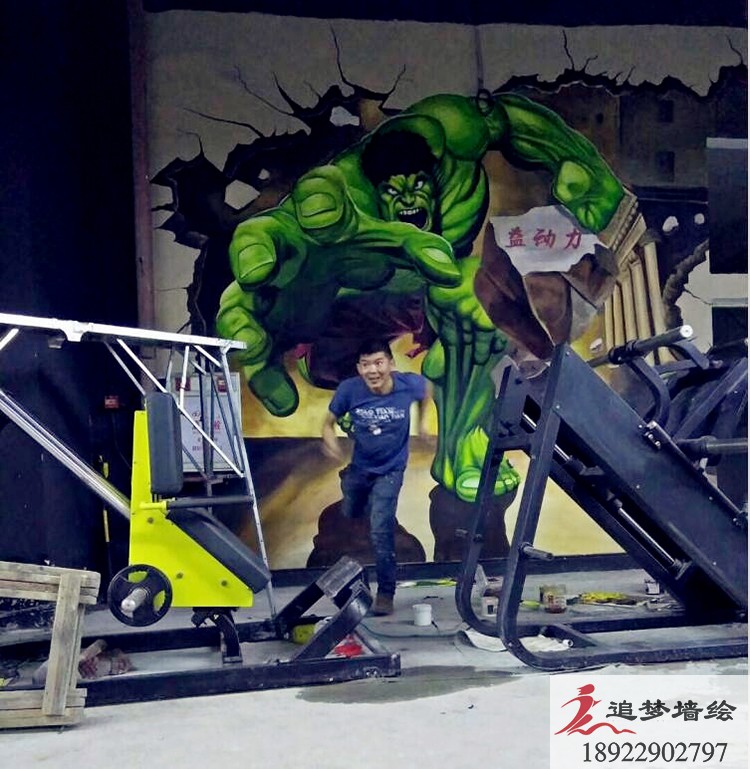 墙绘项目名称:健身房墙绘 3D立体画 绿巨人墙绘 3D彩绘