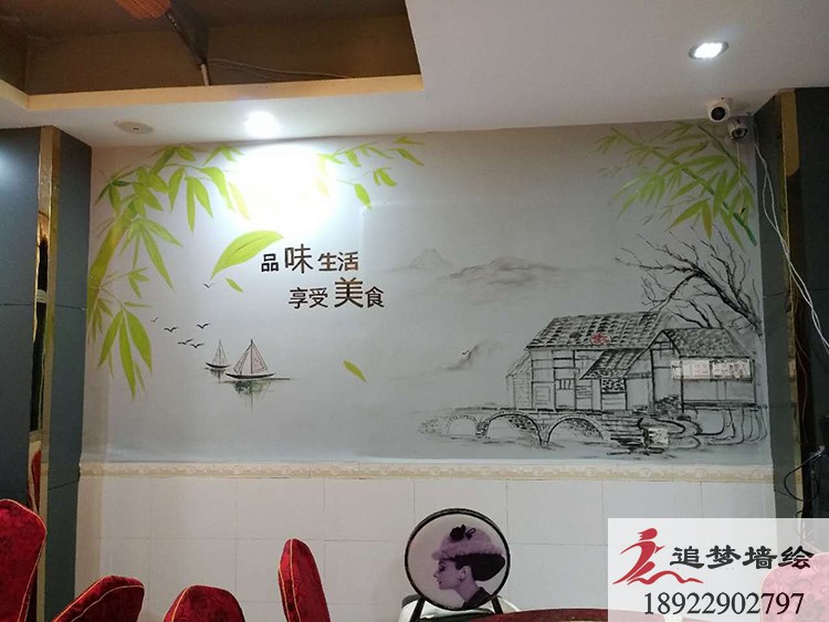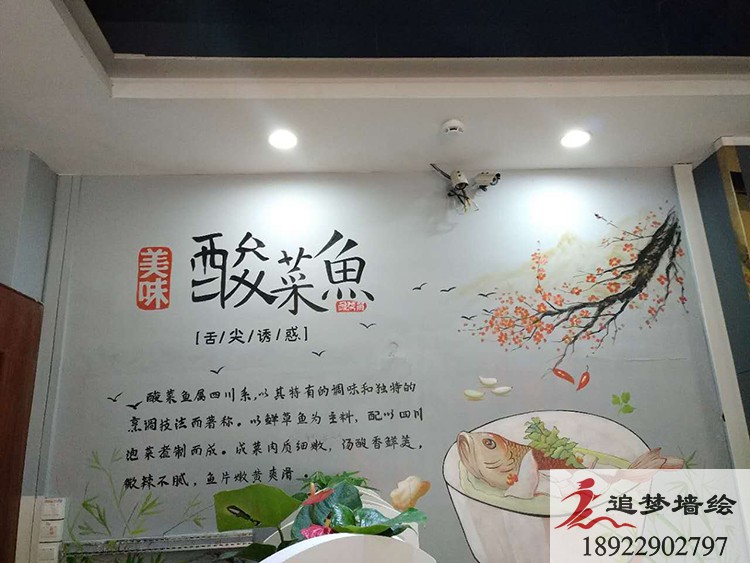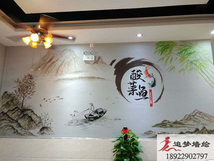 墙绘项目介绍:传统中国菜酸菜鱼配上浓厚的水墨画风,让店铺增添了色彩的同时,也带有浓厚的中国味