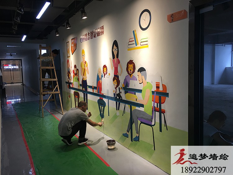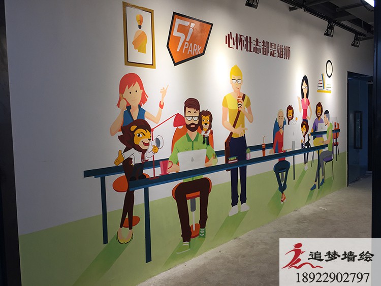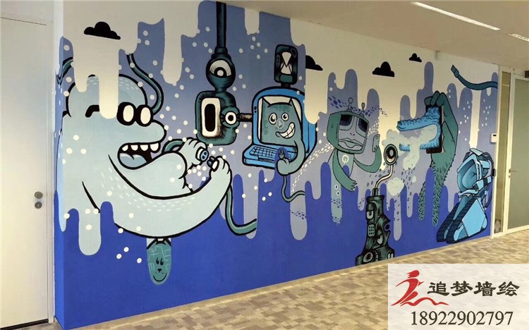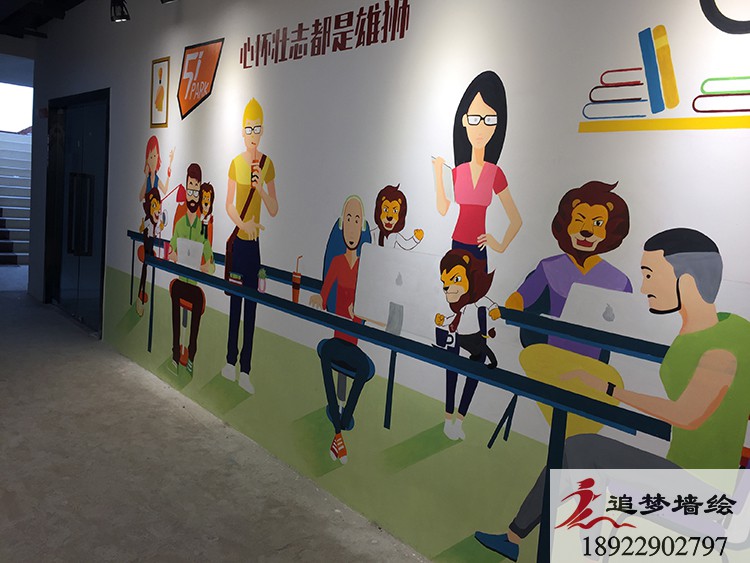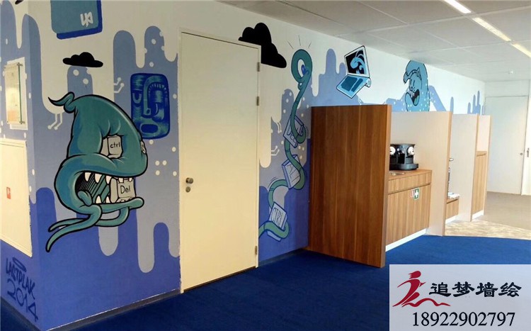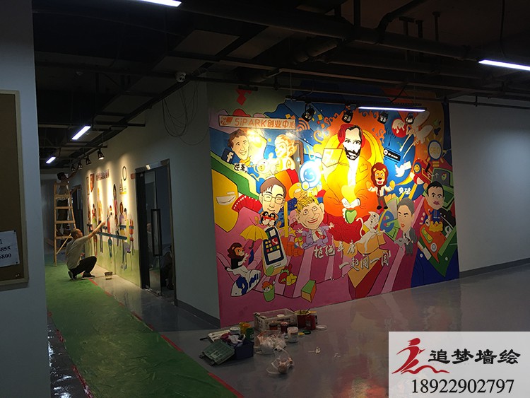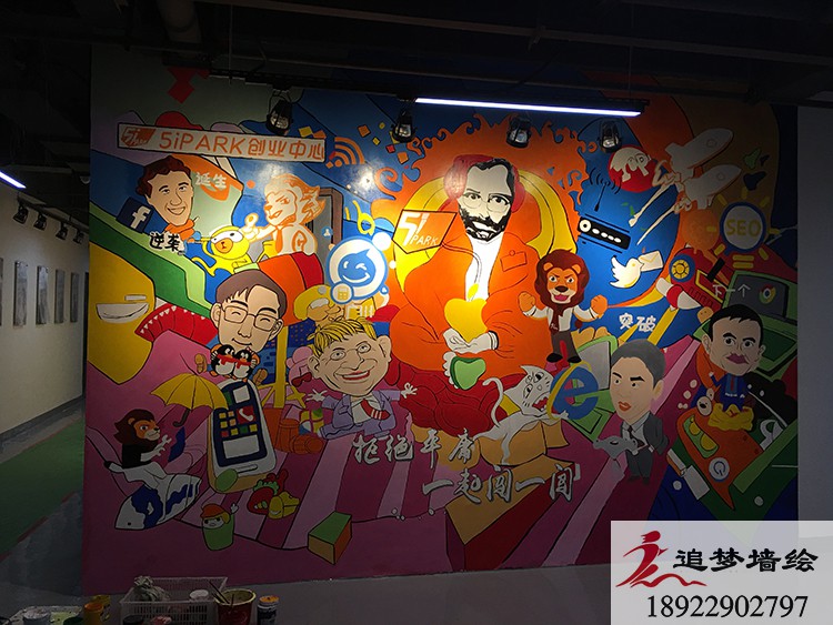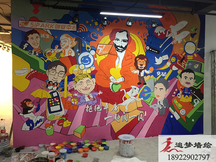 墙绘项目介绍:客户需要和互联网有相关的设计,因此在设计的时候我们充分融入了六大IT界的大咖和一些互联网的元素进行设计,第二幅图是以在办公室努力工作的青年们为题材进行设计的,表现了当代青年对于工作的热血和对未来的憧憬