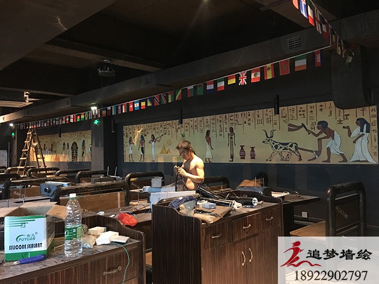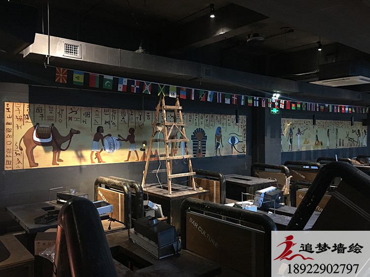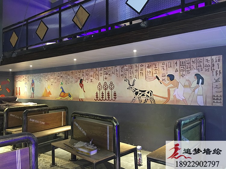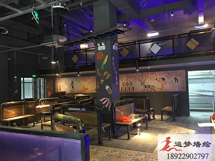 墙绘项目介绍:根据客户的要求,外墙要有在烤肉的主题下融入音乐的元素,因此加入了一些音乐的符号和弹琴的人,内墙里客户需要一些海盗的元素,因此做了一些海盗船和一些海盗的卡通人物来切合主题。还有一面长墙客户需要古埃及的风格,在诸多思考下我们想到了古埃及的壁画风格,从而设计的这一张图,整个工程下来,得到了客户的表扬和赞同。