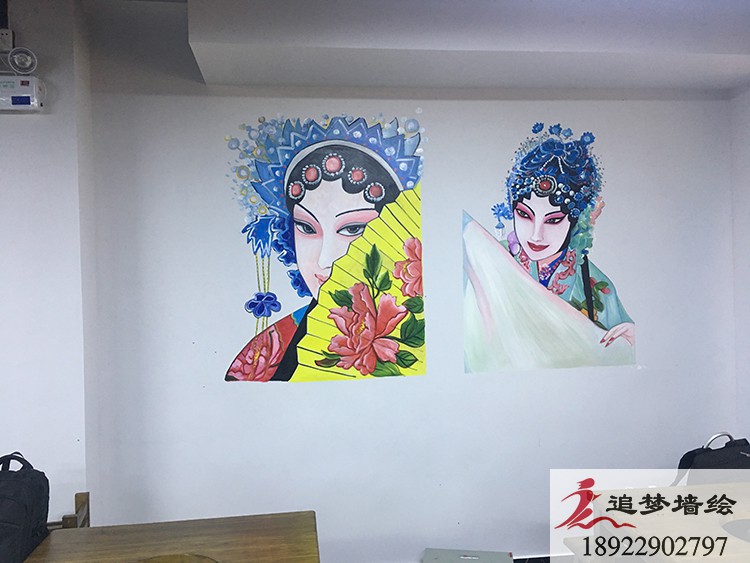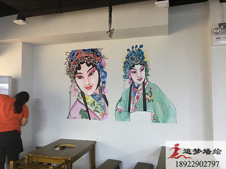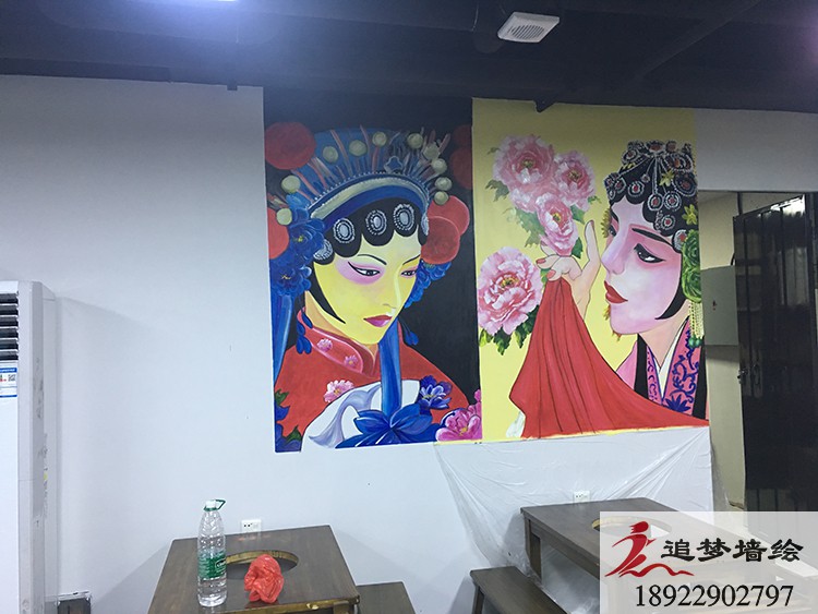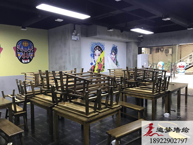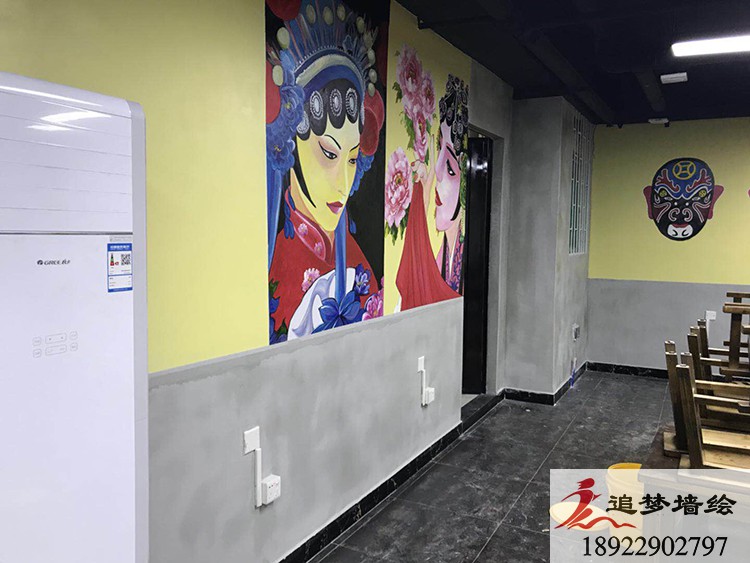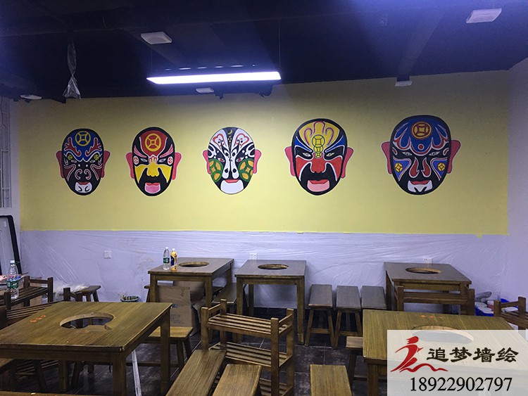 墙绘项目介绍:根据客户的要求,我们结合了传统戏剧花旦人物和五财神脸谱,长墙上也做了一些火辣的辣椒图案,让店铺看起来更加的红红火火,风味十足。