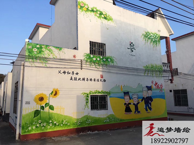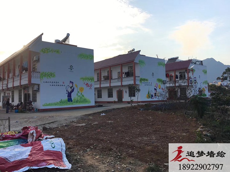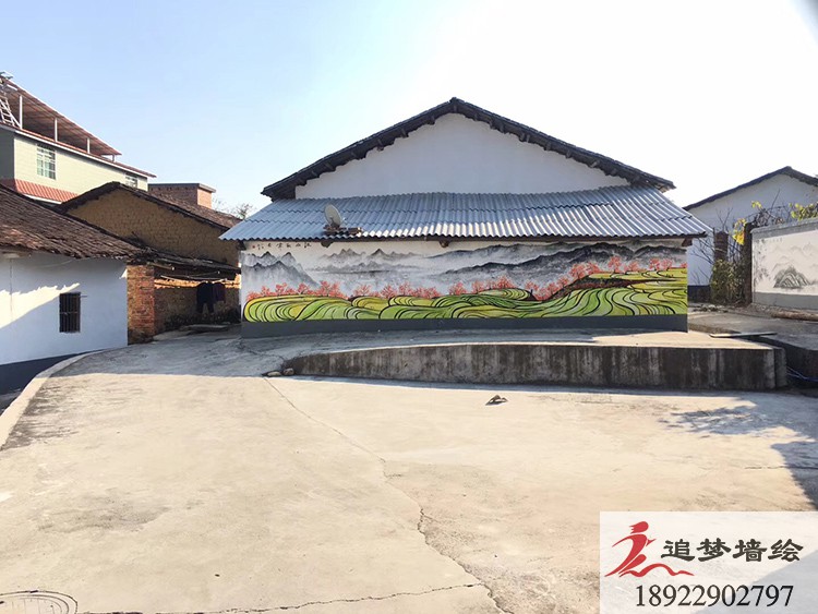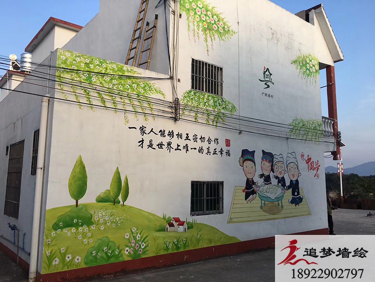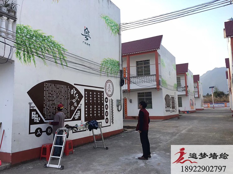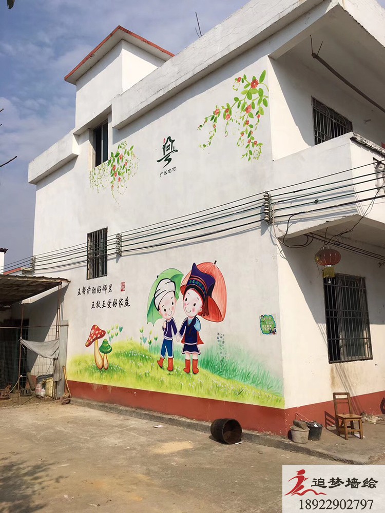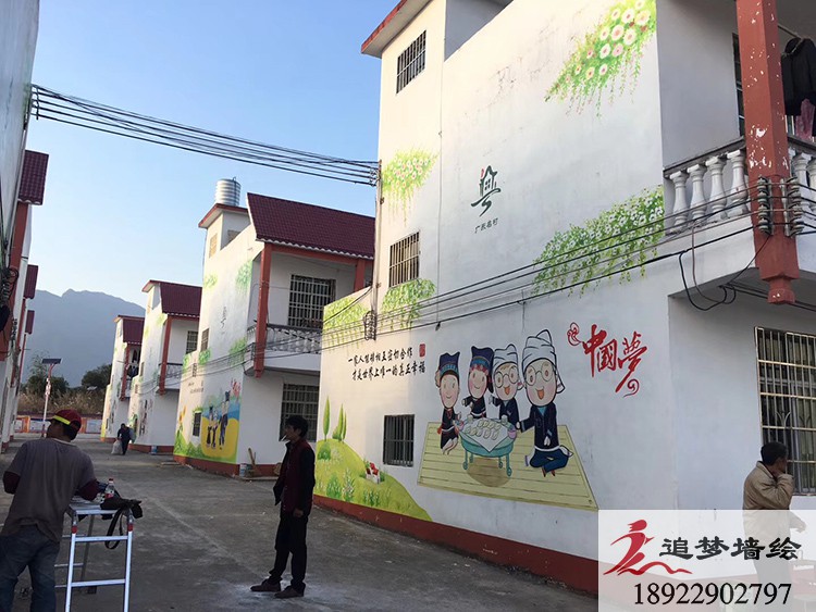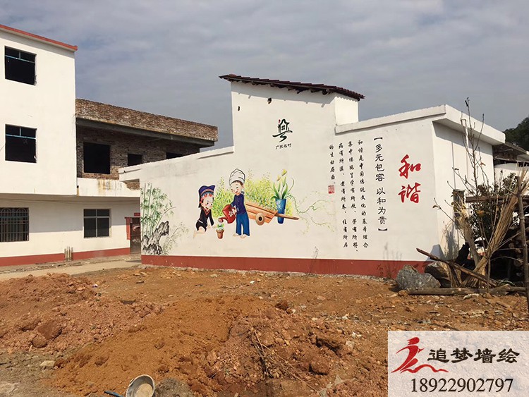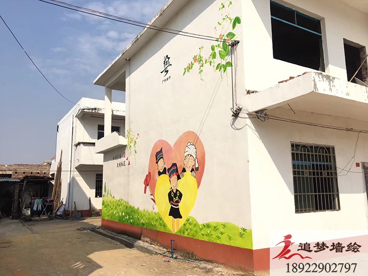 墙绘项目介绍:根据客户的要求,结合了当地瑶族的特色风格服装和文化同时结合了中国梦的主题来进行设计,在主题保证的情况下加上了一些绿叶让画面更加丰满且带有生命力。在另外的一些村子里我们还做客家农耕的墙绘和一些水墨风的墙绘,让每一个村都有他独特的风格。