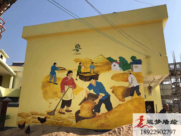 根据客户的要求设计的农耕文化墙绘,鸡都被画面吸引过来了