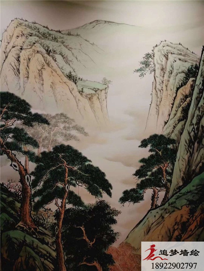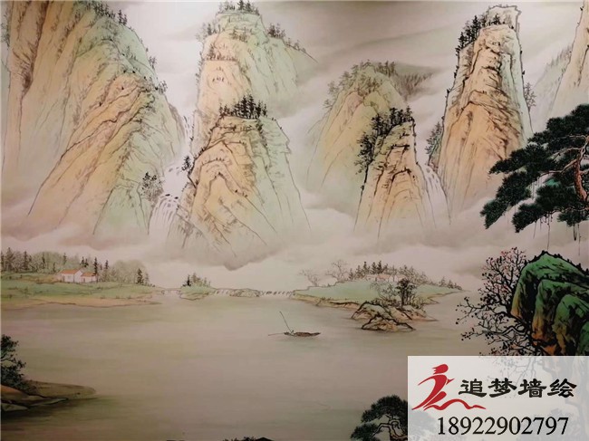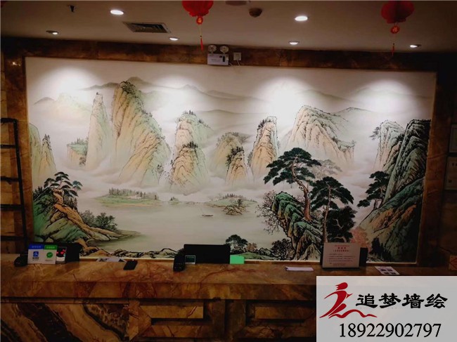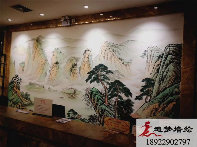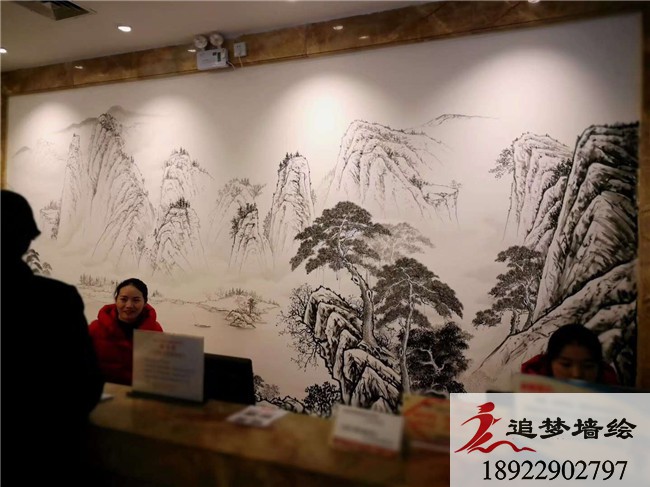 墙绘项目介绍:客户选择的是中国的山水画,符合咱中国的特色,有山有水,聚水为财,背有靠山,生意兴隆,财源广进的寓意。在设计的时候我们充分融入了现场环境,画面融情入景。