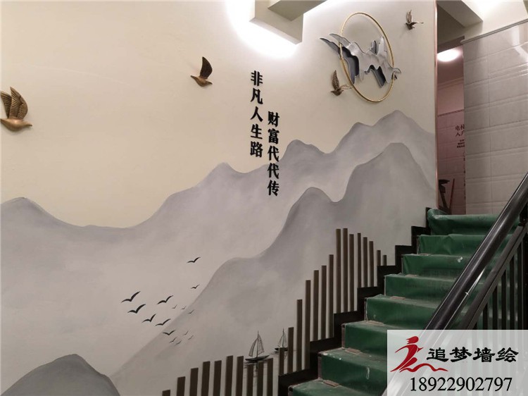 墙绘项目介绍:整个楼道的彩绘以水墨山水画以及一些微派的建筑为背景,加以少许花朵树枝点 缀,勾勒出一幅峰峦叠嶂的秀丽境色。为了拒绝视觉疲劳,我们为此专门在楼道增加了一些立体飞鸟和山峰。