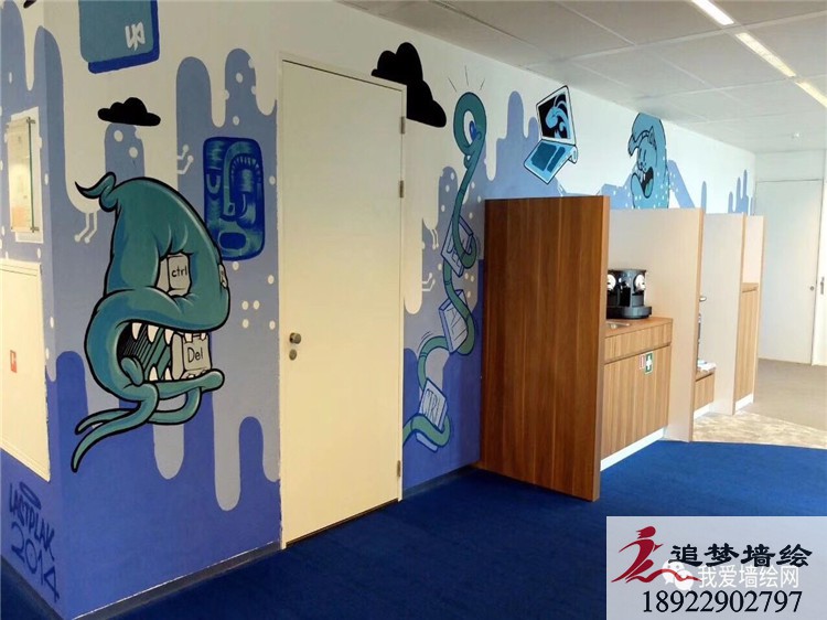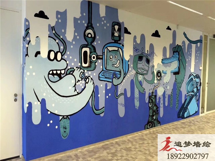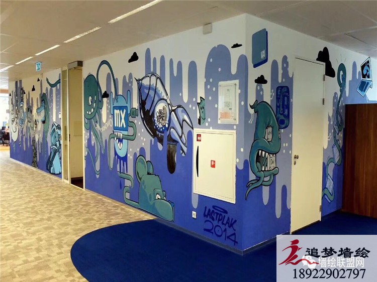 墙绘项目介绍:此次彩绘以冷色系蓝色为主调,搭配让人激情的暖色系。