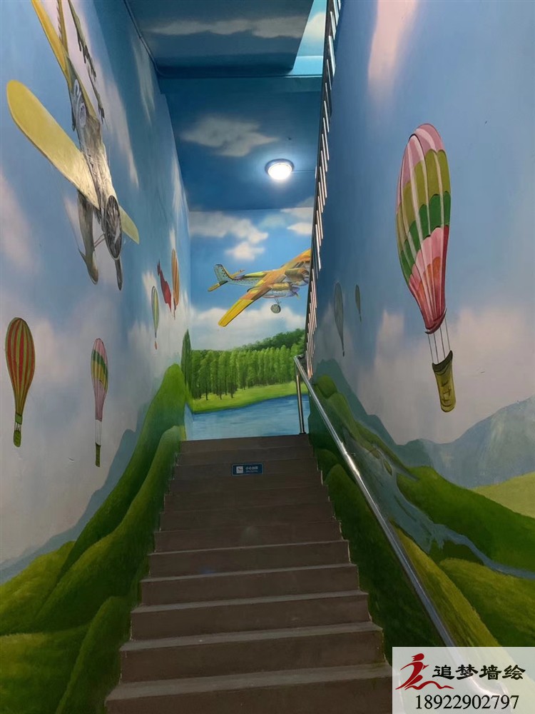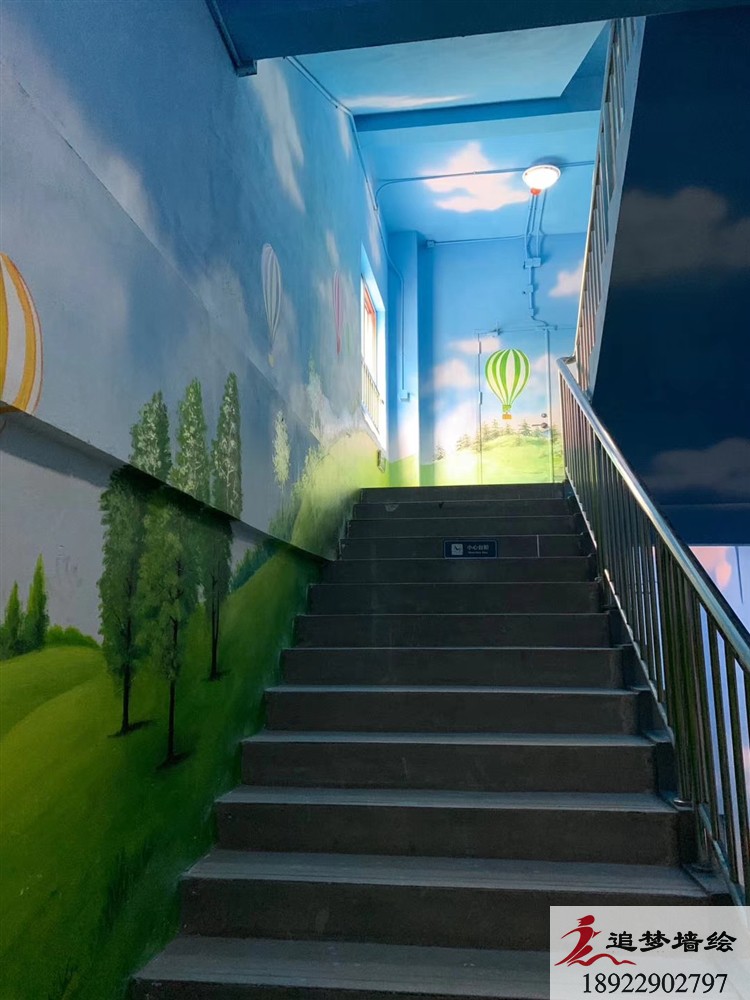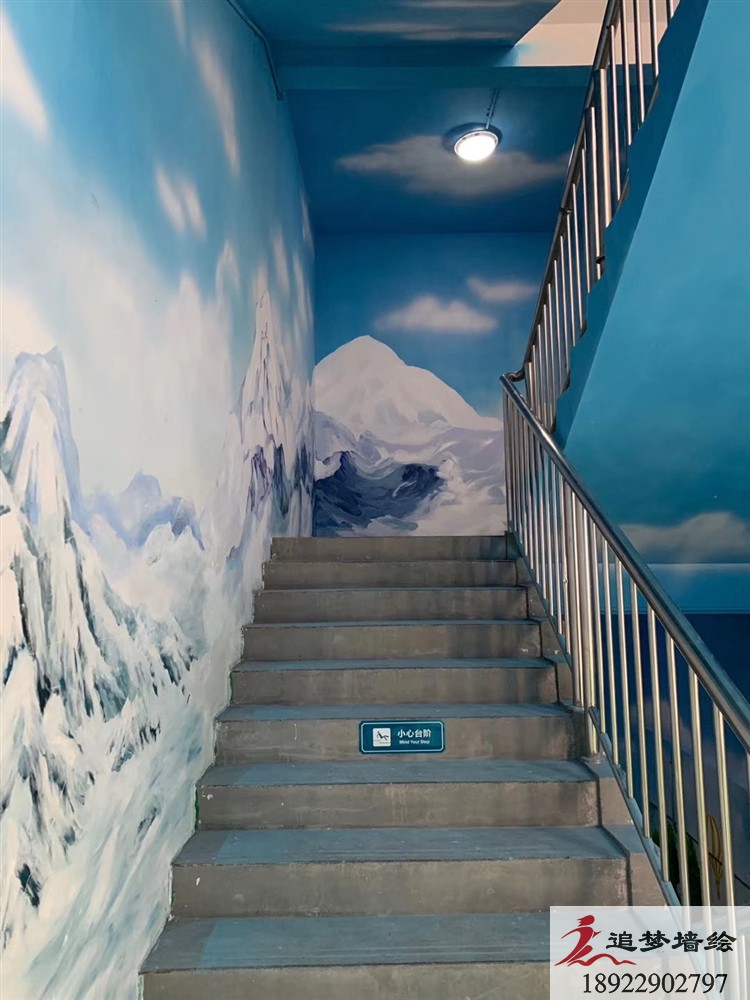 夏日炎热难挡,特别是上下楼梯的时候会让人更加的烦躁。追梦墙绘为白云的某小区的楼梯房绘画了别致的风景,让你不再烦躁,酷炫美丽的冰山肯定能给你带冬天已来的感觉,飞艇飞机在翱翔,还有清新的树林也能给人带来微微的凉意,这样的墙绘让人不再炎热,不再感到烦躁。