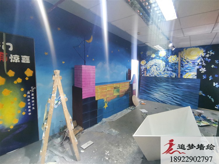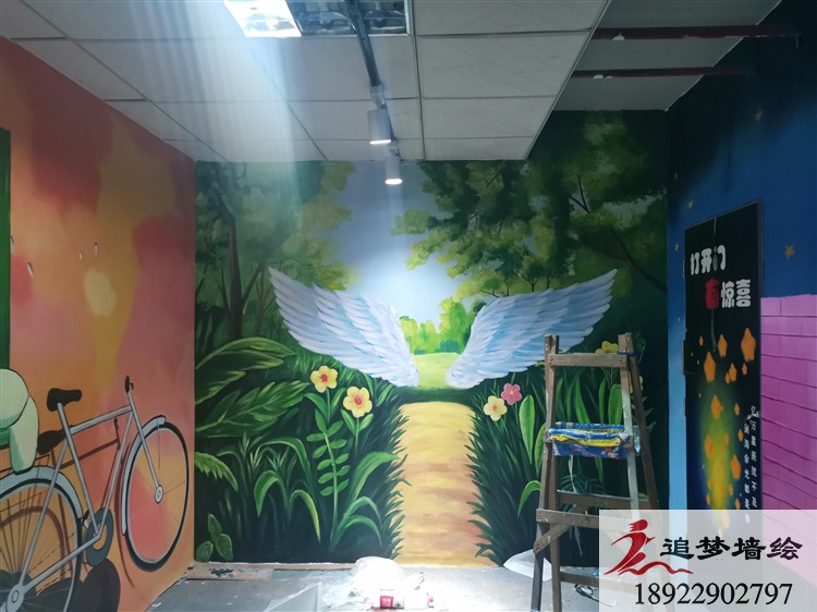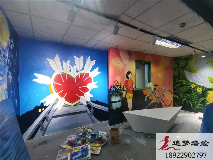 在东莞东城的失恋博物馆翻新装修之际,我们追梦墙绘有幸与其合作,为失恋博物馆绘画了不少有趣又时尚的墙绘。失恋博物馆是一个网红打卡,年轻人很喜欢去的地方,所以我们绘画的作品与年轻人的生活相接近,如星辰大海、月亮星光、动漫的单车女孩、被箭刺穿的心、天使的翅膀等。观赏性好,趣味足,逼真的墙绘更使得年轻人促足停留。