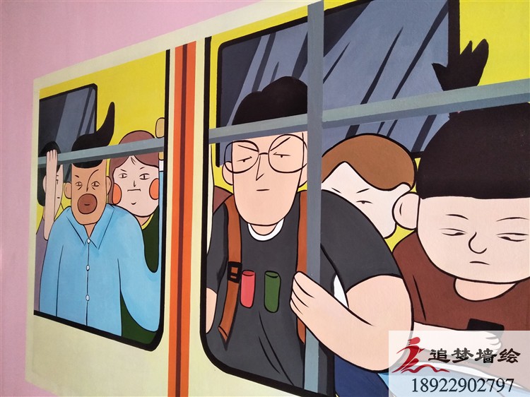 追梦墙绘从事专业艺术绘画15年,承接各种类型的墙绘。今年8月在广州某商场绘画了一些趣味画面,在经过与商家多次交流后才将这些画面一一展现。首先是飞跃出电视屏的地铁、正在安检乘客的工作人员、挤在地铁里的乘客还有商场的导览图等。展现了一张张可爱有趣的画面,很好达到娱乐场所的活跃气氛。