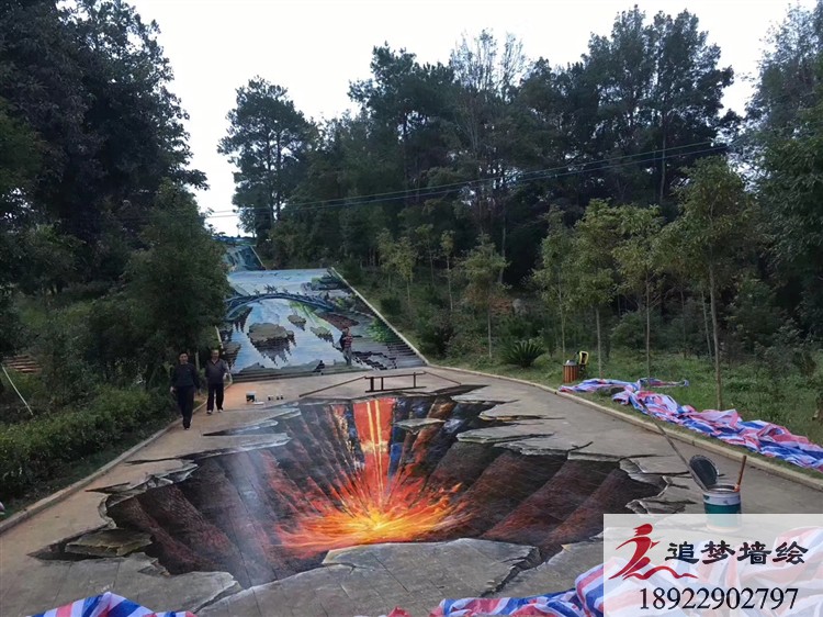 这是福州的一座公园,这里环境优美,适宜休闲玩耍,但却缺少一些趣味性的东西。园方为了增添活力和趣味,想要做墙绘的东西,但是没有确切的方向,于是我们为他们规划好,除了这面很大墙可以画东西之外,其实还可以在地上画东西的。于是我们就为他们设计了些3D视觉感比较强的画面,不用多久这些渔民开船扑鱼、火山熔岩、山水瀑布就呈现到墙上和地面了。他们感到很满意,因为这样一来不仅风趣了许多,人们还可以结合这些画面拍出有意思的照片。