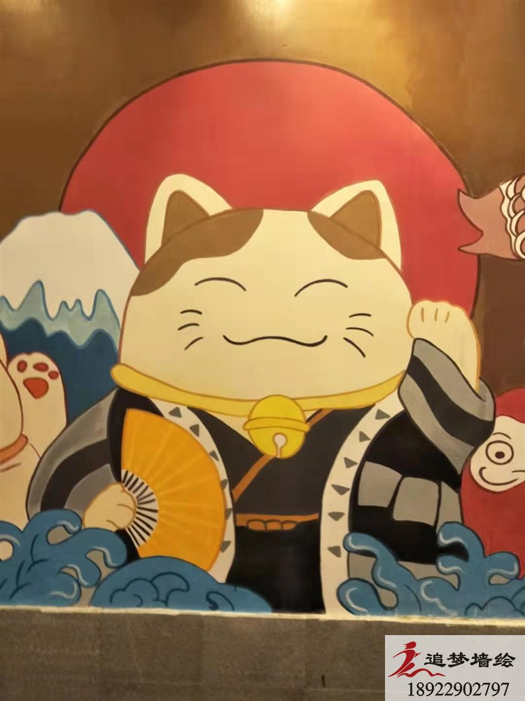 御寿司。这又是一餐饮类型的店,在绘画餐饮店的墙绘方面我们追梦墙绘做得也不少了,特别是日式料理店、火锅店、奶茶店的比较多。这次的御寿司又是日式料理的店,自然就画一些日式风格的图画咯。红日出海、鲤鱼飞翔、喜庆的招财猫,千年飞翔围绕着“御寿司”的品牌名,还有千叶树和飞翔的白鹤。这些画面为店增添一些“日本气氛”,给人更有一种是在日本吃寿司的感觉。