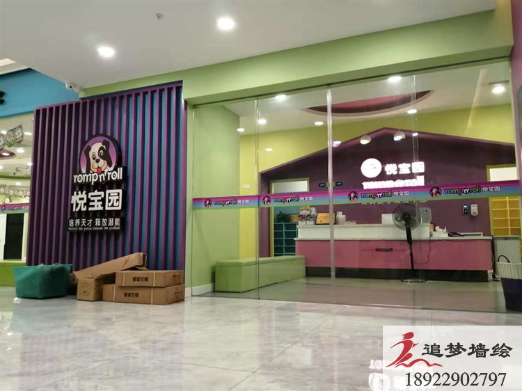 这是在中山市,一个叫“悦宝园”的幼儿园,他们快要开业了,装修什么的都做得差不多了,但还是觉得缺少了些什么,于是想到了墙绘,而他们这里一边是芭迪熊亲幼馆,另一半才是悦宝园的rompy幼儿园,他们想要结合芭迪熊和rompy狗狗起来设计。接着他们把芭迪熊和rompy吉祥物的动作形态发给了我,还有他们那里的装修风格和色调。沟通商量过后我就开始忙活起来了,经过两三天的奋斗,就为他们设计好了,需要修改的次数也并不多。然后画师再花了两三天的时间,就完整的把这三面墙给画完了。芭迪熊出门找rompy狗狗玩耍、rompy狗狗扑蝴蝶蜻蜓、芭迪熊喝饮料等等画面,很好展示出了芭迪熊和rompy狗狗你中有我,我中有你的场景。