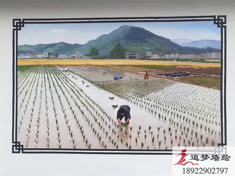 江门旅游产业文化村。江门为了打造“千亿文旅产业”推进文旅融合,增添文化气氛,在各个村子里规划绘画一些创意文化墙绘。正好遇到追梦墙绘并与我们合作,于是我们按照村委的要求设计绘画了一些有趣的墙画。如农民们插秧的场景、建筑房子、梅花、孩童玩耍、妇人煮饭等等。画上这样的一幅幅有趣的图画,更加能吸引游客到这些村子里来游玩。