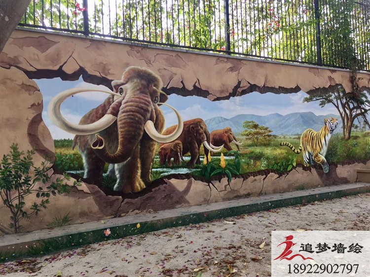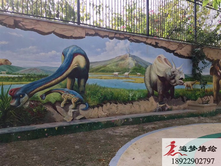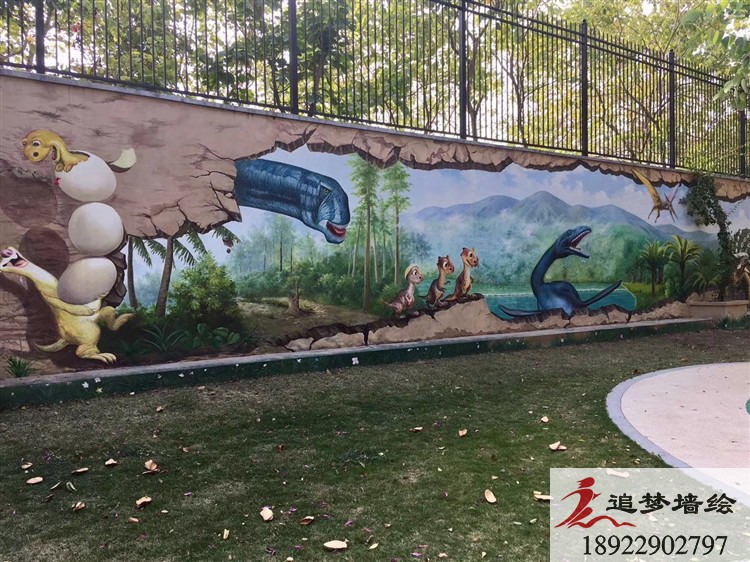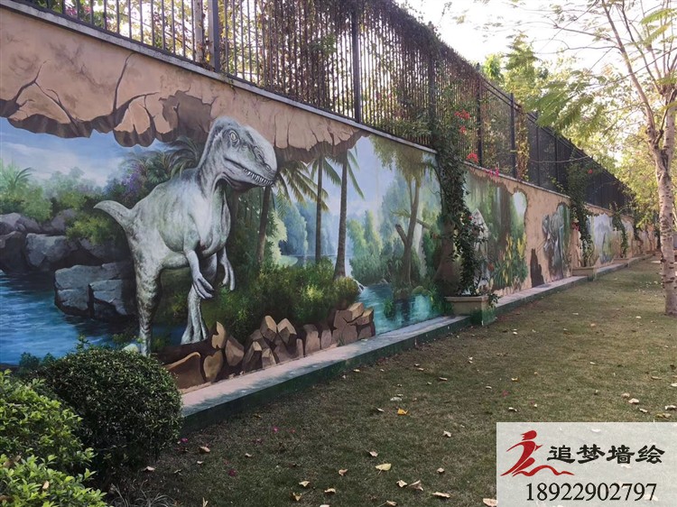 公园墙绘。这次又是公园方面的彩绘,在公园里的一个休闲娱乐的长廊边上,就是我们这次要画的“画布”,园方表示想画一些有趣的3D动物画面,于是我们便将《侏罗纪公园》和《冰河世纪》的一些画面给他看,他看到后觉得很满意,还说可以稍微搞得有创意一些,我们就跟他说可以两个结合起来,然后画成3D效果这样。很快我们的设计师就设计出了一个大概的效果给园方,他说没问题了,我们就可以施工了。这些霸王龙、翼龙还有冰河世纪的猛犸象等等画不是很容易,但画这些,再在它们的外边加上墙,3D效果就容易的呈现出来了。