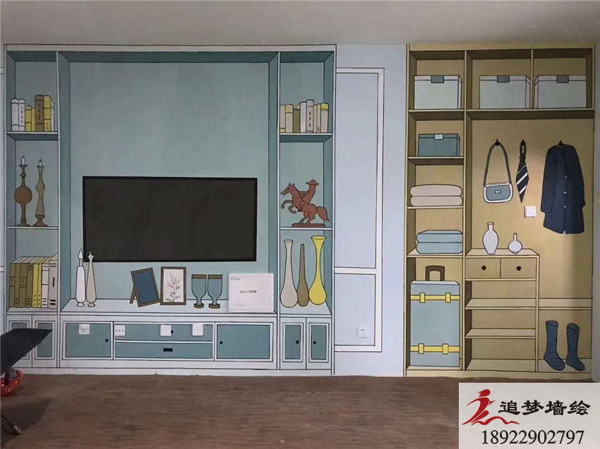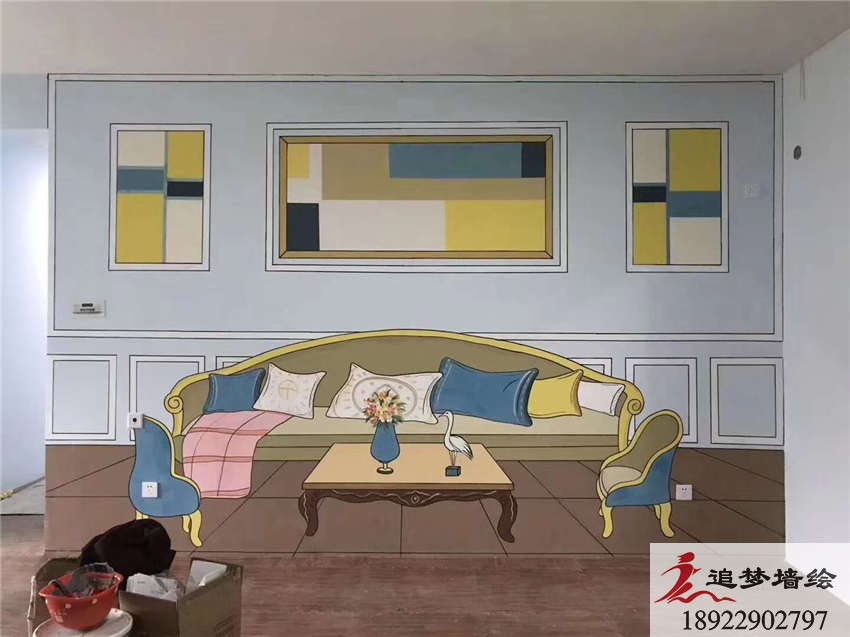 墙绘项目介绍:该项目的样板房彩绘采用了写实和场景相结合的方式,在适当的位置绘制具有代表性的家具