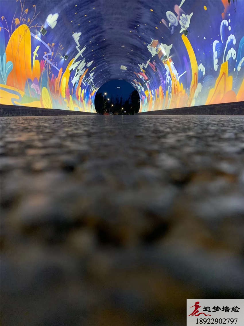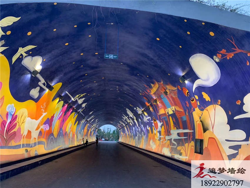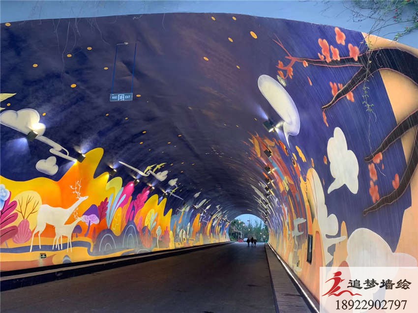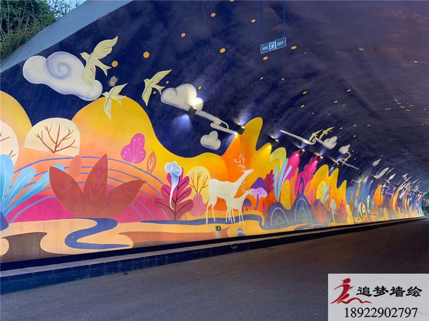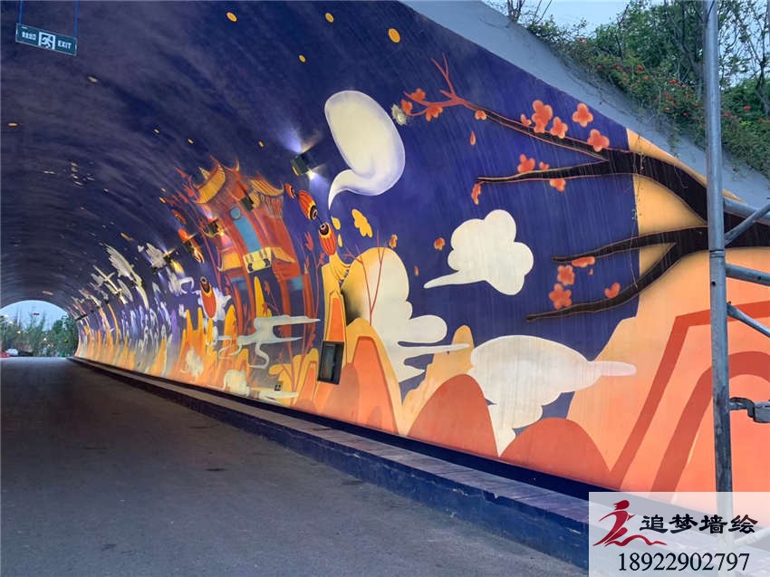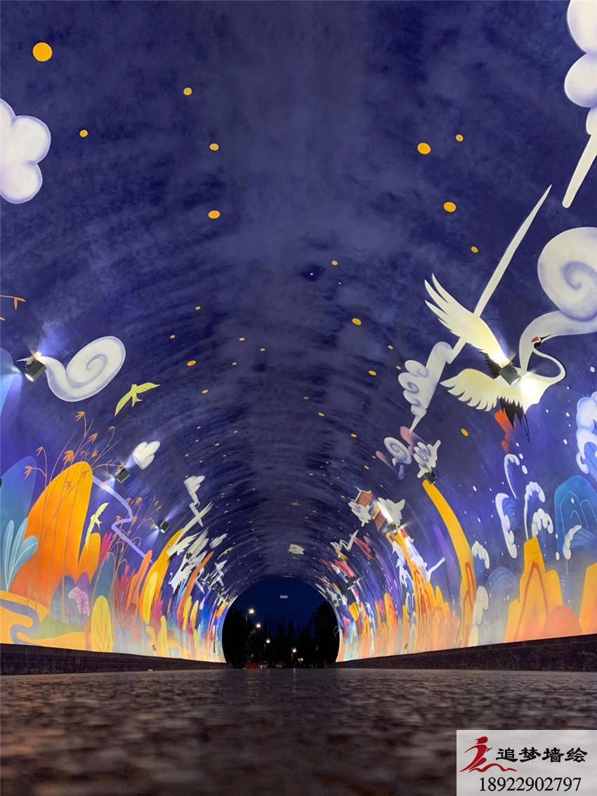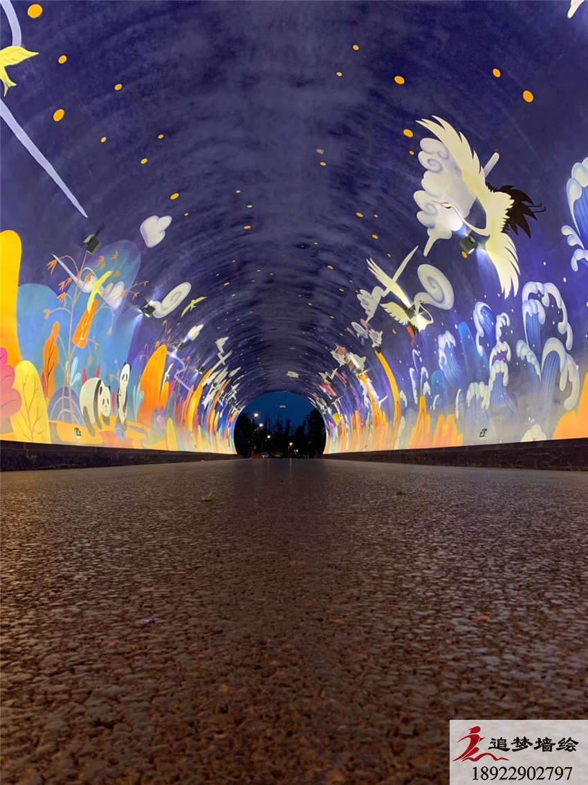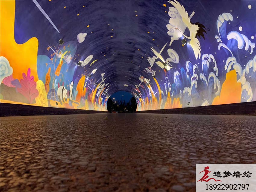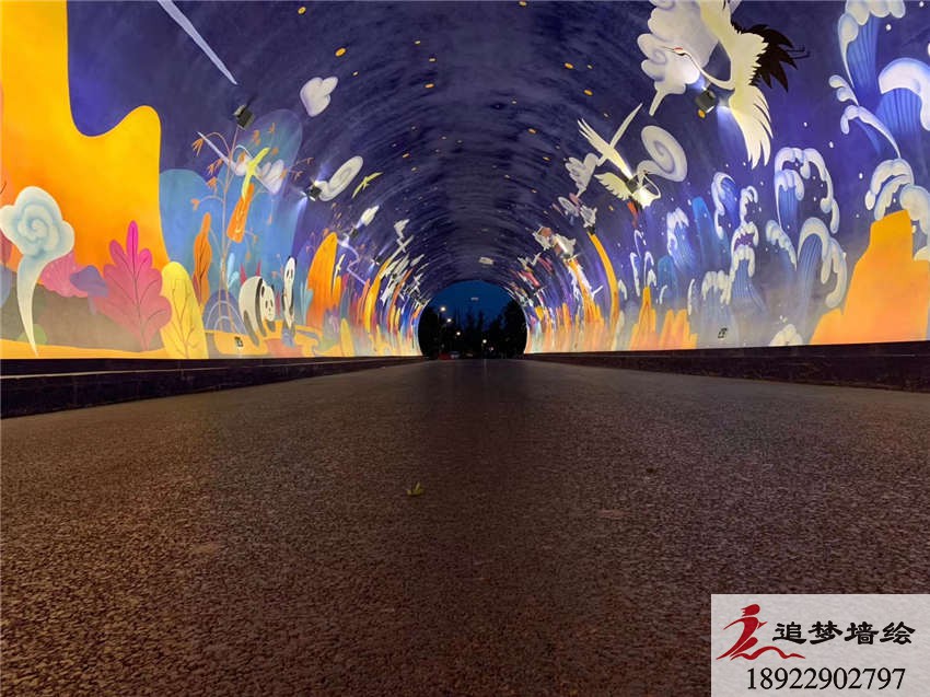 珠海隧道彩绘这个项目,我们追梦墙绘一起策划,设计出比较梦幻的设计方案,以具有梦幻代表性的紫色色调为主,搭配橙色,用各种各样梦幻的图案,文字,把画面做的精彩生动,色调明快,协调统一,仙鹤,云彩,熊猫等图案都展示了梦幻的内涵!