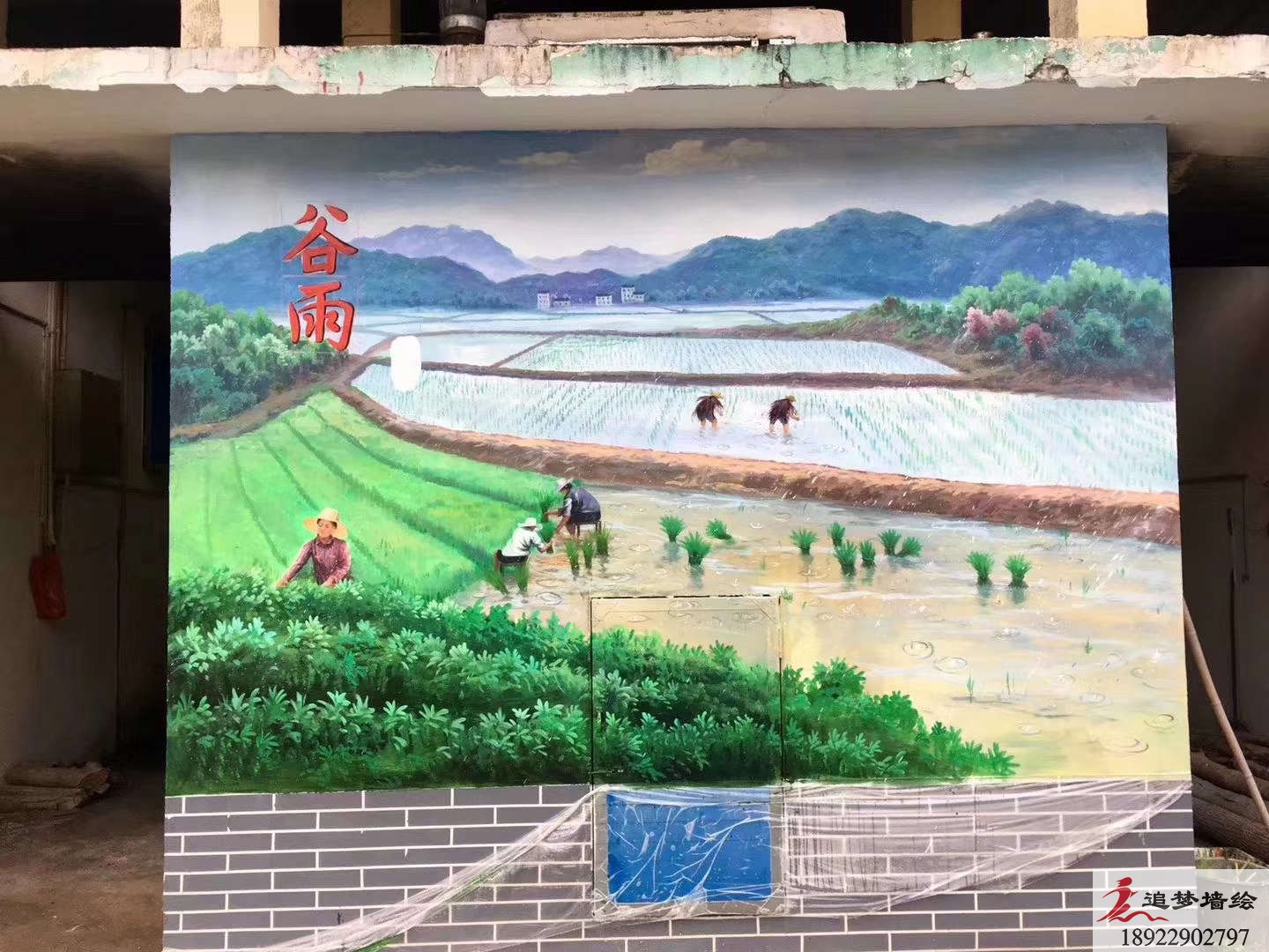 清远这个项目的彩绘在不同的墙面设计不同的彩绘图案。我们设计师以油画风格为主,用各种各样和谐的农耕场景把画面做的精彩生动,色调明快,协调统一,展示了符合乡村气息的内容。