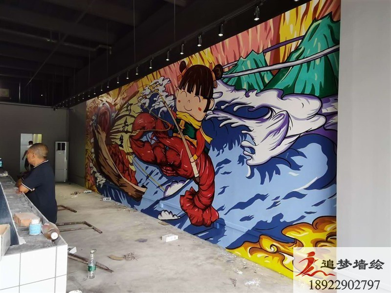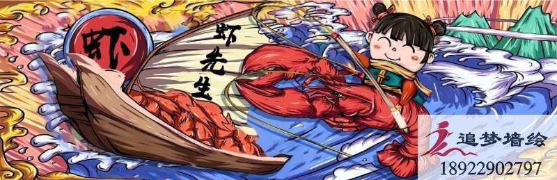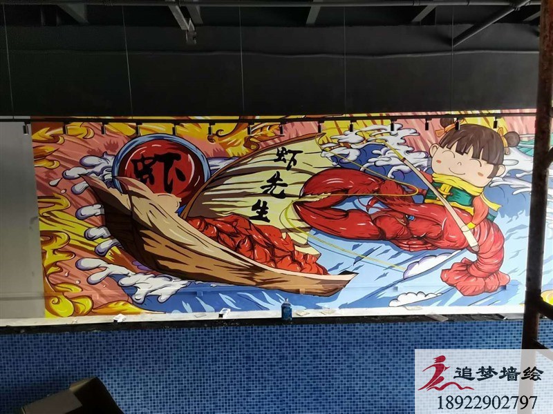墙绘项目介绍:番禺这个项目,绘制彩绘图案整体设计主要围绕“钓虾”为主题。我们设计师以涂鸦风格为主,用海浪、龙虾、钓虾的涂鸦人物和谐的把整个画面做的精彩生动,色调明快,协调统一,展示了符合钓虾气息的内容。