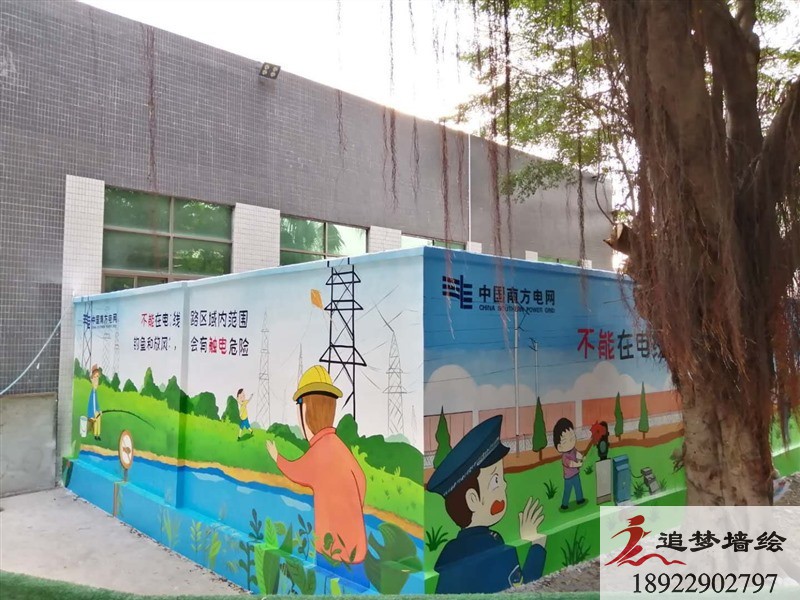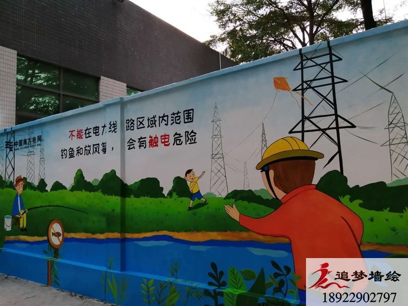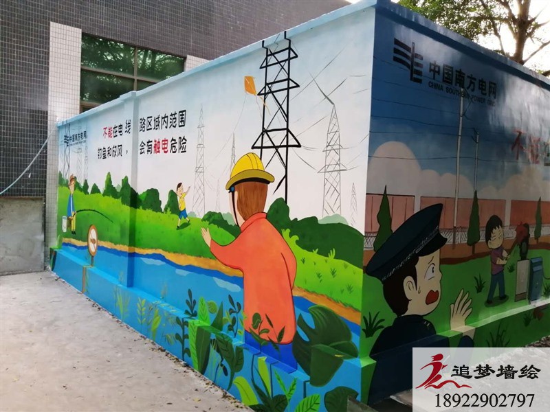 墙绘项目介绍:黄江这个项目的彩绘在不同的墙面设计不同的彩绘图案。我们设计师以卡通风格为主,用各种各样和谐的禁止靠近电线杆的场景,把画面做的精彩生动,色调明快,协调统一,展示了符合触电危险的内容。