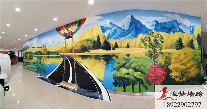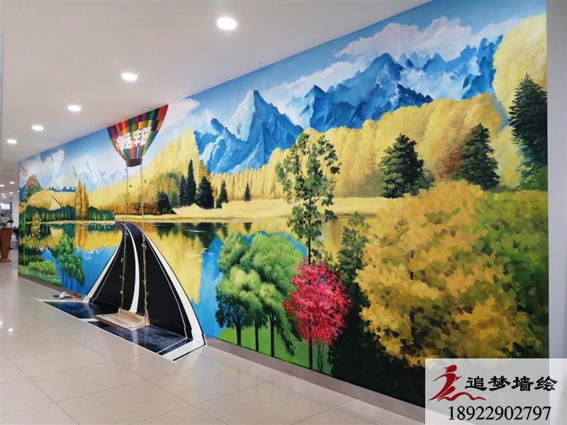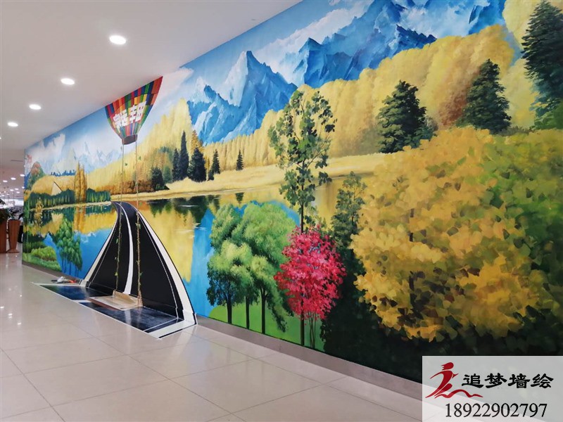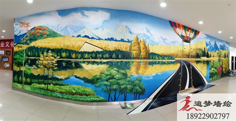 墙绘项目介绍:柯木塱这个项目的彩绘在不同的墙面设计不同的彩绘图案。我们设计师以油画风格为主,用各种各样和谐的山水场景把画面做的精彩生动,色调明快,协调统一,展示了符合山水自然气息的内容。