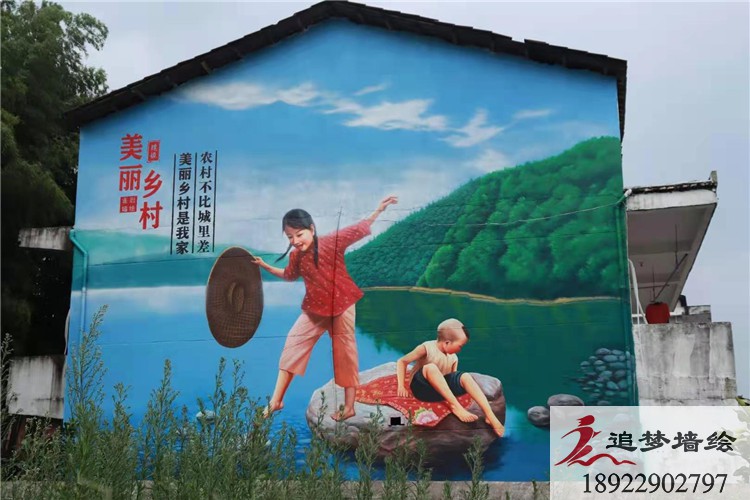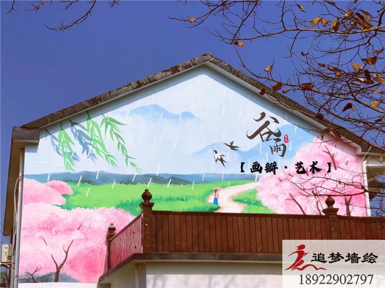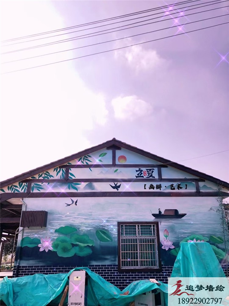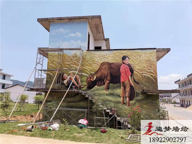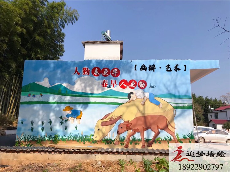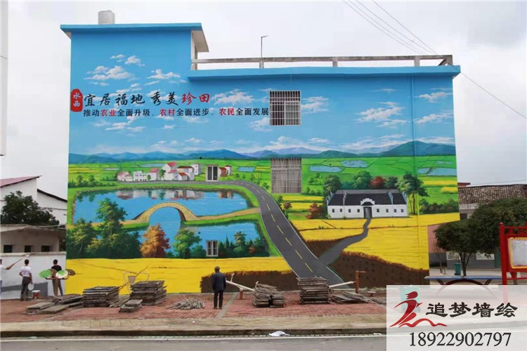 墙绘项目介绍: 整个设计是结合了农村文化,加油干的干劲,色彩丰富,激情,活力这些都达到了。客户寻找我们追梦墙绘一起策划。我们设计师切合实际,以与农村特色相结合为主,配合图案,一些文字字母,把画面做的精彩生动,协调统一,展示了农村的氛围和打破农村刻板印象的涂鸦
