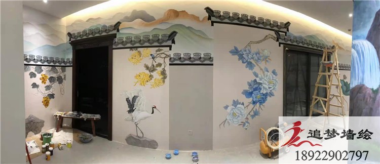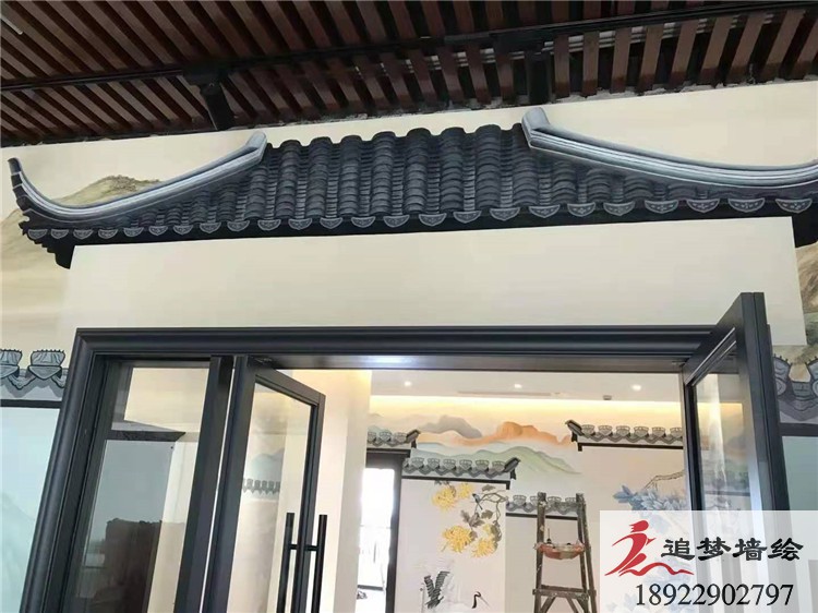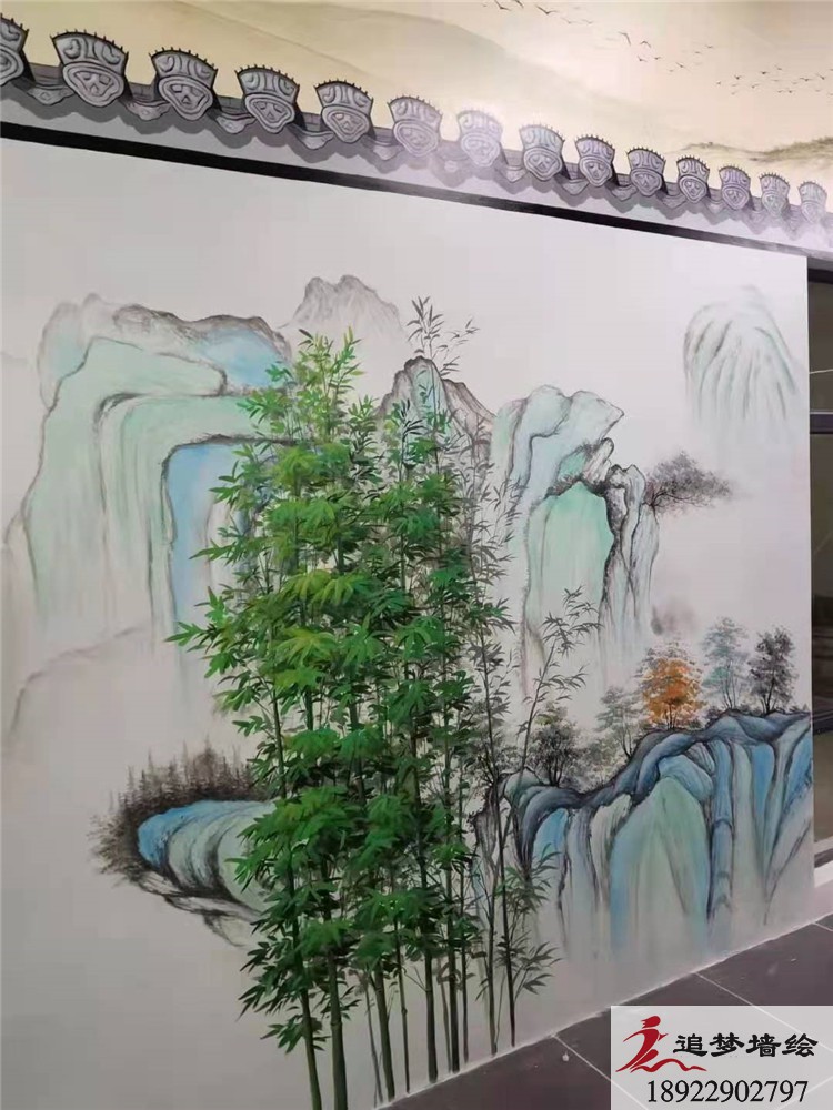 墙绘项目介绍:整个项目的彩绘以水墨山水画为背景,加以少许花朵竹子点 缀,勾勒出一幅峰峦叠嶂的秀丽境色。为了拒绝视觉疲劳,我们为此专门在门口增加了一些立体屋顶