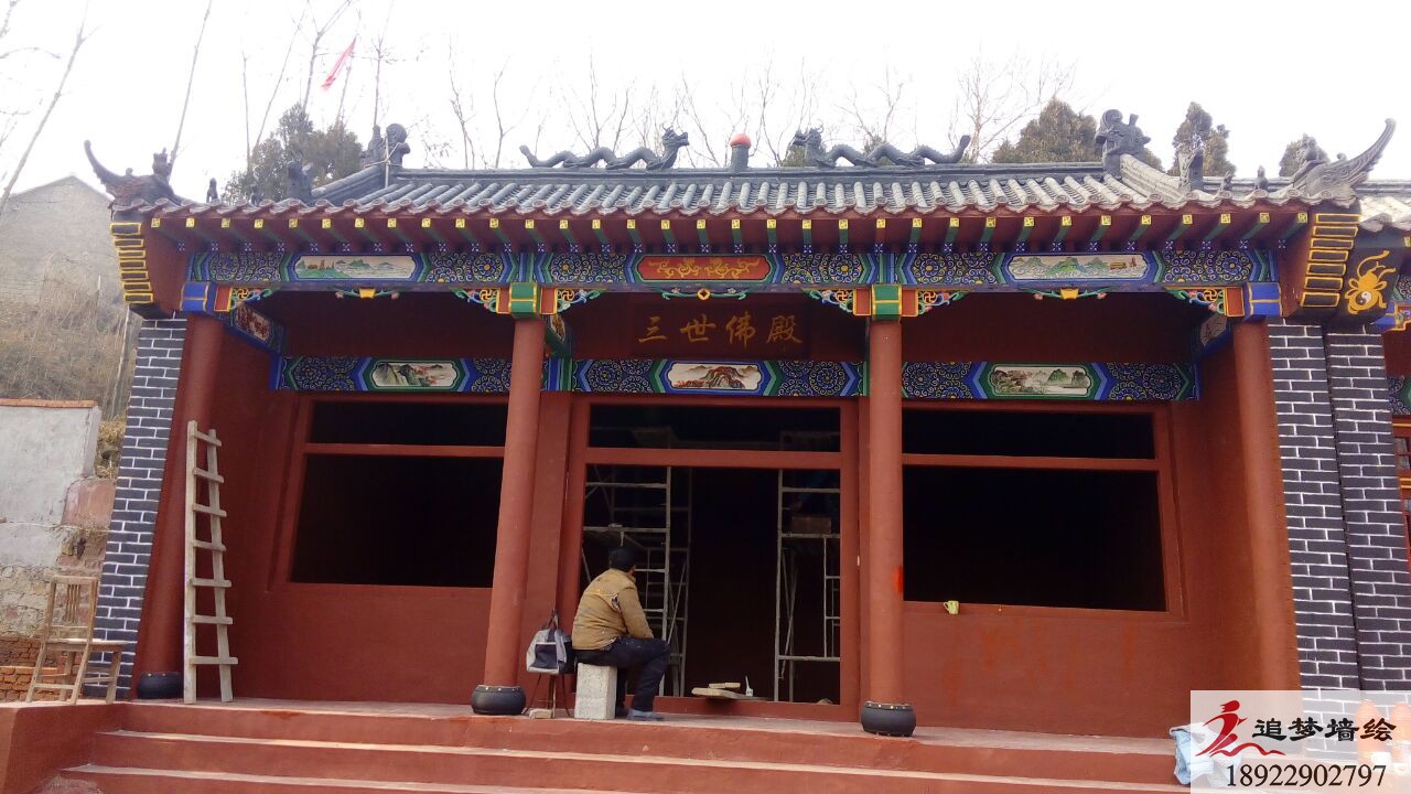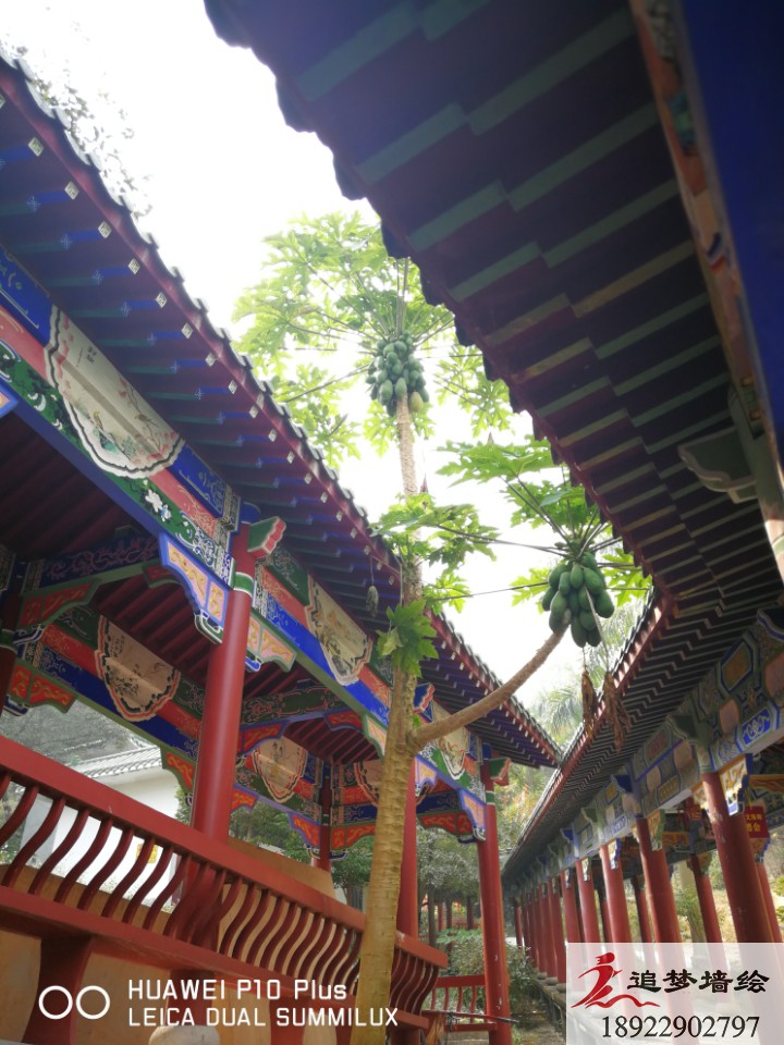 墙绘项目介绍:这个项目的彩绘方式是旋子彩绘,可以根据不同要求做的很华贵或很素雅。这种彩绘用途及广,一般官衙、庙宇、牌楼和园林中都采用。把画面做的精彩生动,色调明快,协调统一,展示了符合古人祭祀场景自然气息的内容