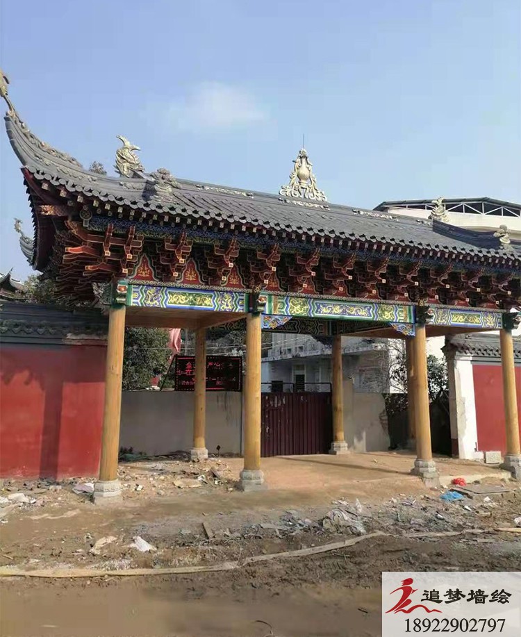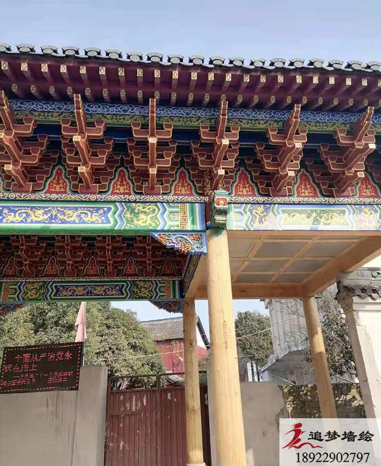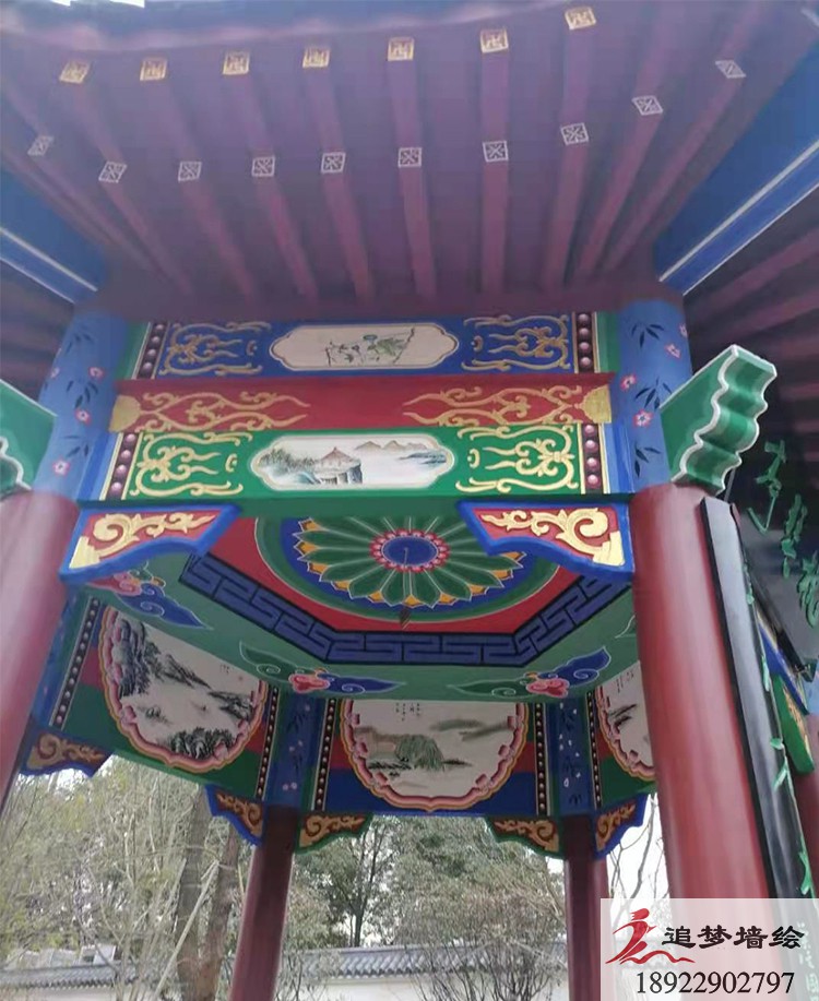 墙绘项目介绍: 这个项目的古建筑彩绘是根据岭南文化进行彩绘图案设计。是由苏式、旋子、和玺彩画融合而成的彩绘效果与其他古建筑彩绘风格大致一致,却体现了当地特色习俗与审美。用丰富色彩把画面做的精彩生动,色调明快,协调统一,具有地方特色。