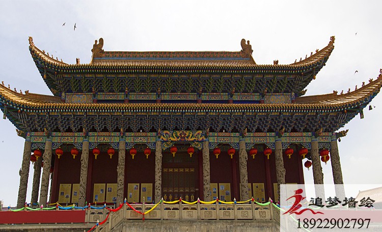 墙绘项目介绍:这个项目的彩绘方式是旋子彩绘,可以根据不同要求做的很华贵或很素雅。这种彩绘用途及广,一般官衙、庙宇、牌楼和园林中都采用。把画面做的精彩生动,色调明快,协调统一,展示了符合古人祭祀场景自然气息的内容。