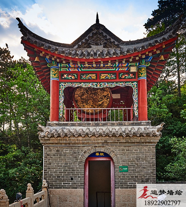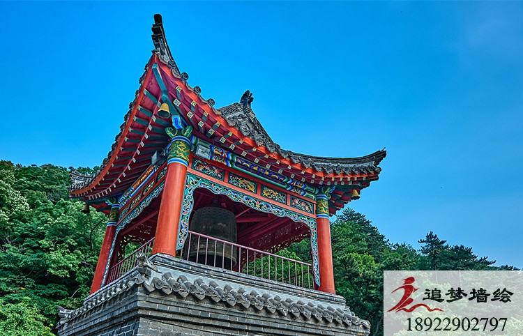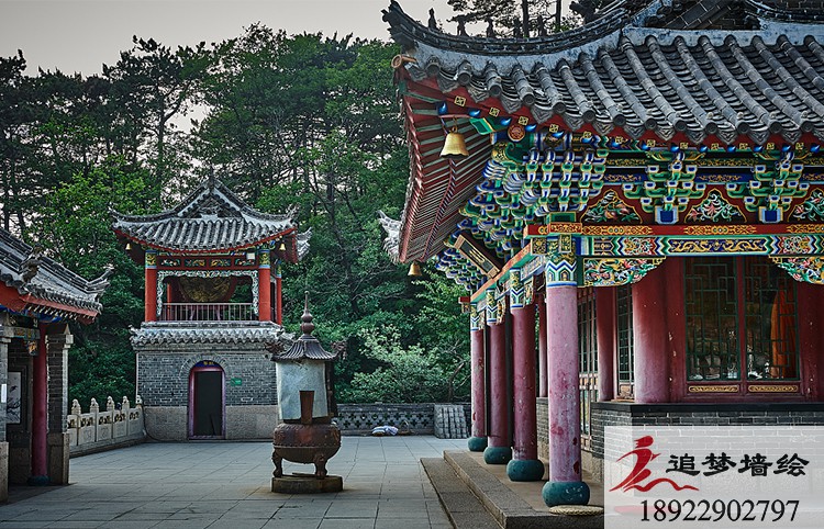 墙绘项目介绍:这个项目的彩绘方式是旋子彩绘,可以根据不同要求做的很华贵或很素雅。这种彩绘用途及广,一般官衙、庙宇、牌楼和园林中都采用。把画面做的精彩生动,色调明快,协调统一,展示了符合古人祭祀场景自然气息的内容。
