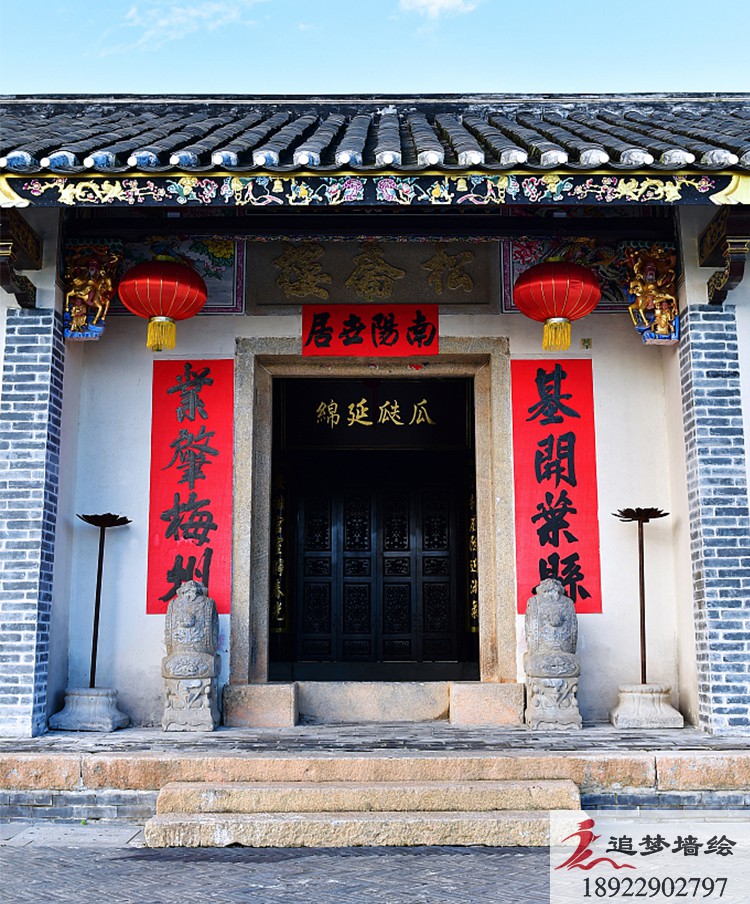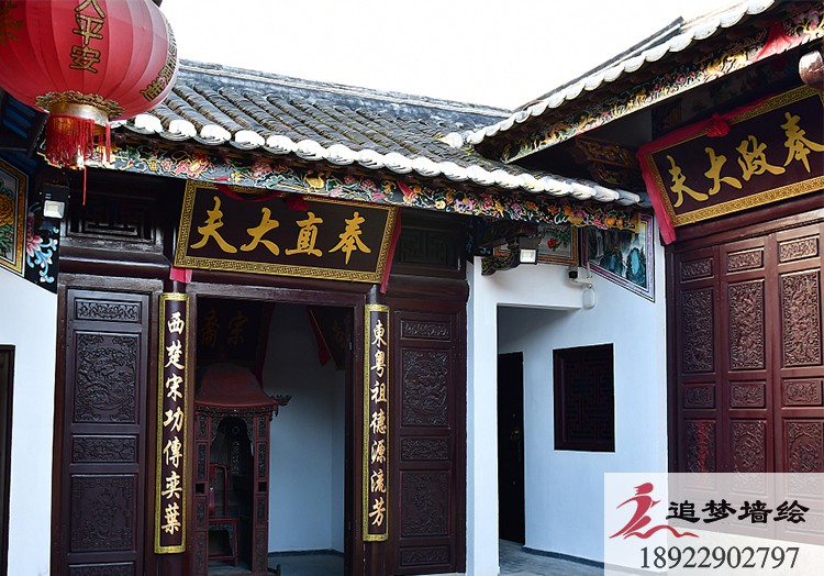 墙绘项目介绍: 这个项目的古建筑彩绘是根据岭南文化进行彩绘图案设计。是由苏式、旋子、和玺彩画融合而成的彩绘效果与其他古建筑彩绘风格大致一致,却体现了当地特色习俗与审美。用丰富色彩把画面做的精彩生动,色调明快,协调统一,具有地方特色。