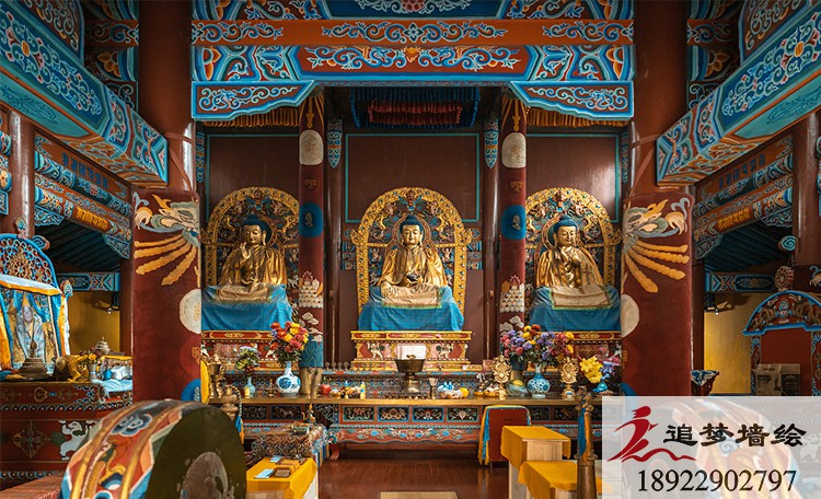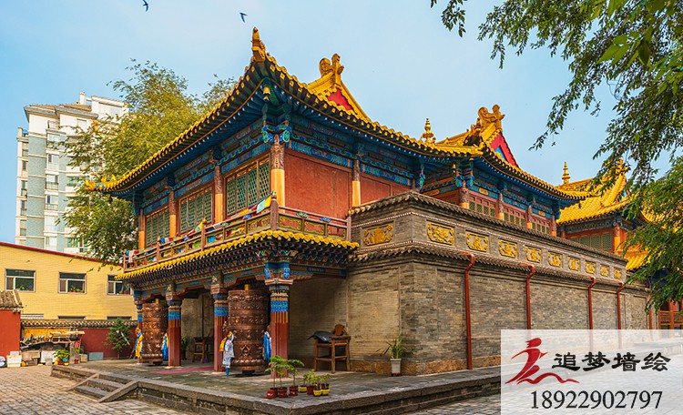 墙绘项目介绍: 这个项目的古建筑彩绘是根据岭南文化进行彩绘图案设计。是由苏式、旋子、和玺彩画融合而成的彩绘效果与其他古建筑彩绘风格大致一致,却体现了当地特色习俗与审美。用丰富色彩把画面做的精彩生动,色调明快,协调统一,具有地方特色。