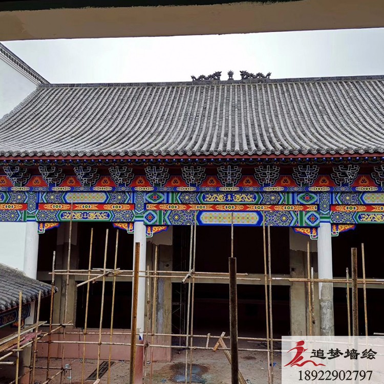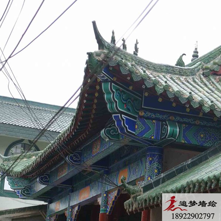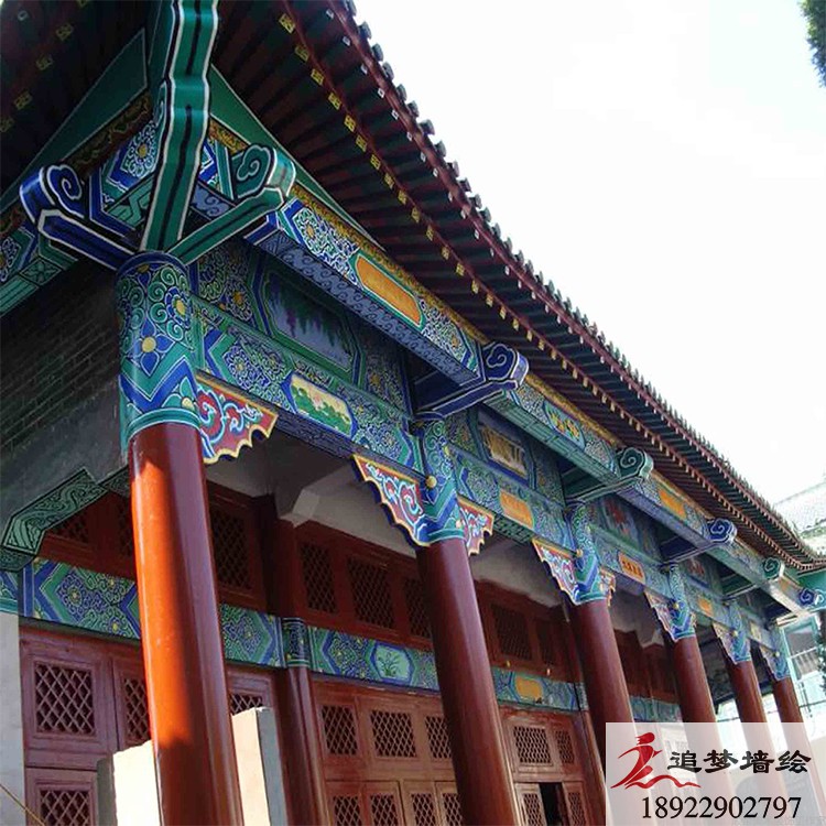 墙绘项目介绍:这个项目的古建筑彩绘是根据岭南文化进行彩绘图案设计。是由苏式、旋子、和玺彩画融合而成的彩绘效果与其他古建筑彩绘风格大致一致,却体现了当地特色习俗与审美。用丰富色彩把画面做的精彩生动,色调明快,协调统一,具有地方特色。