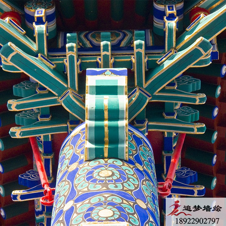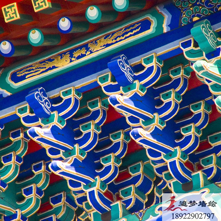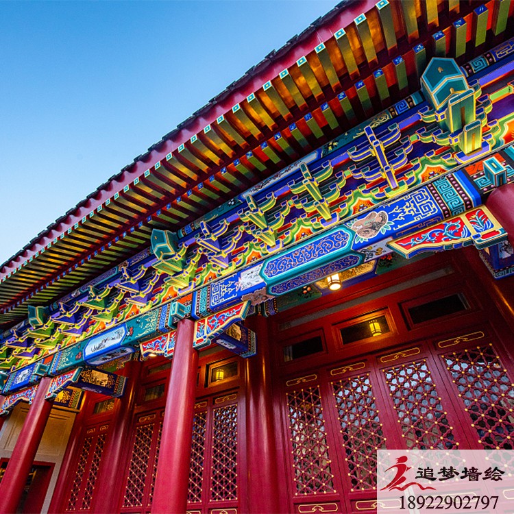 墙绘项目介绍:这个项目的彩绘方式是苏式彩绘,多用于园林和住宅四合院。苏式彩绘除了又生动活泼之外,“包袱”里还有人物、故事、山水等。把画面做的精彩生动,色调明快,协调统一,展示了符合古人生活场景自然气息的内容。