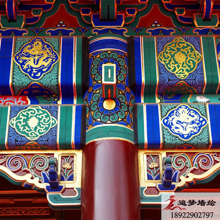 墙绘项目介绍: 这个项目的古建筑彩绘是根据岭南文化进行彩绘图案设计。是由苏式、旋子、和玺彩画融合而成的彩绘效果与其他古建筑彩绘风格大致一致,却体现了当地特色习俗与审美。用丰富色彩把画面做的精彩生动,色调明快,协调统一,具有地方特色。