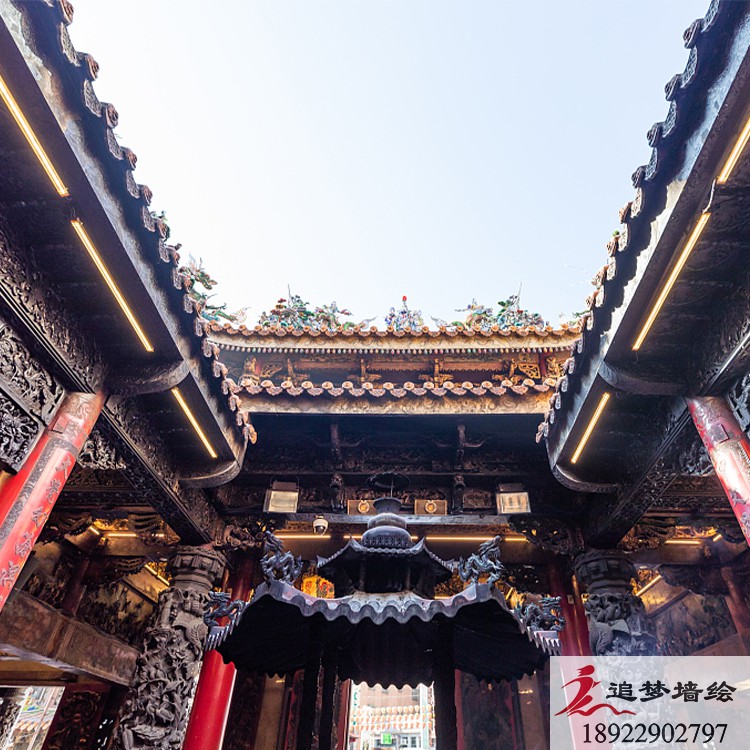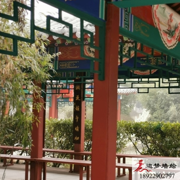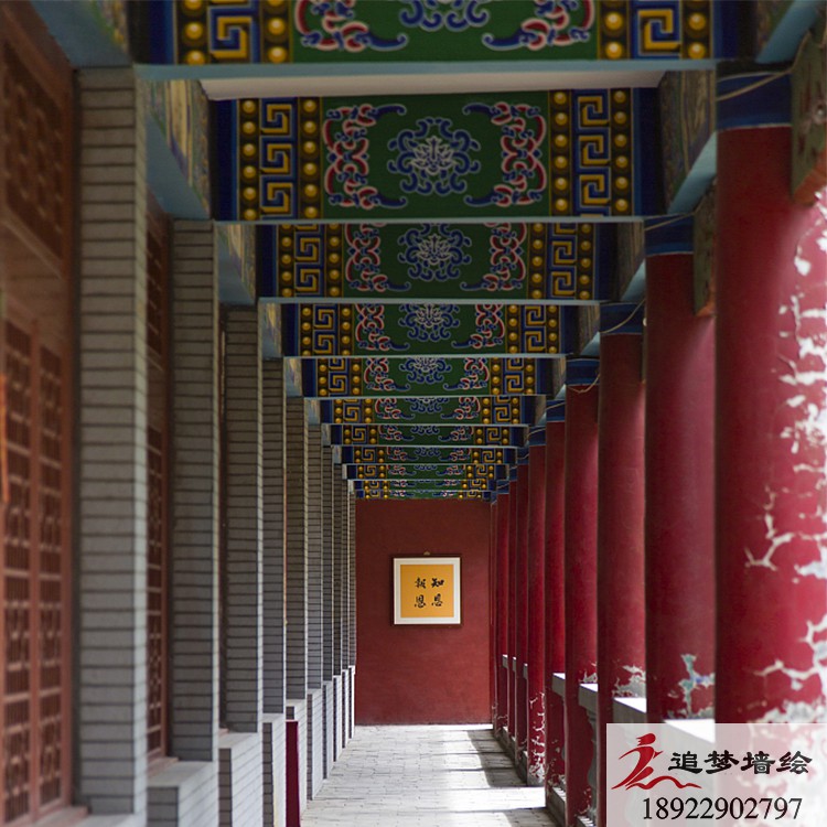 墙绘项目介绍: 这个项目的古建筑彩绘是根据岭南文化进行彩绘图案设计。是由苏式、旋子、和玺彩画融合而成的彩绘效果与其他古建筑彩绘风格大致一致,却体现了当地特色习俗与审美。用丰富色彩把画面做的精彩生动,色调明快,协调统一,具有地方特色。