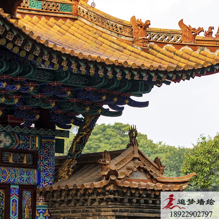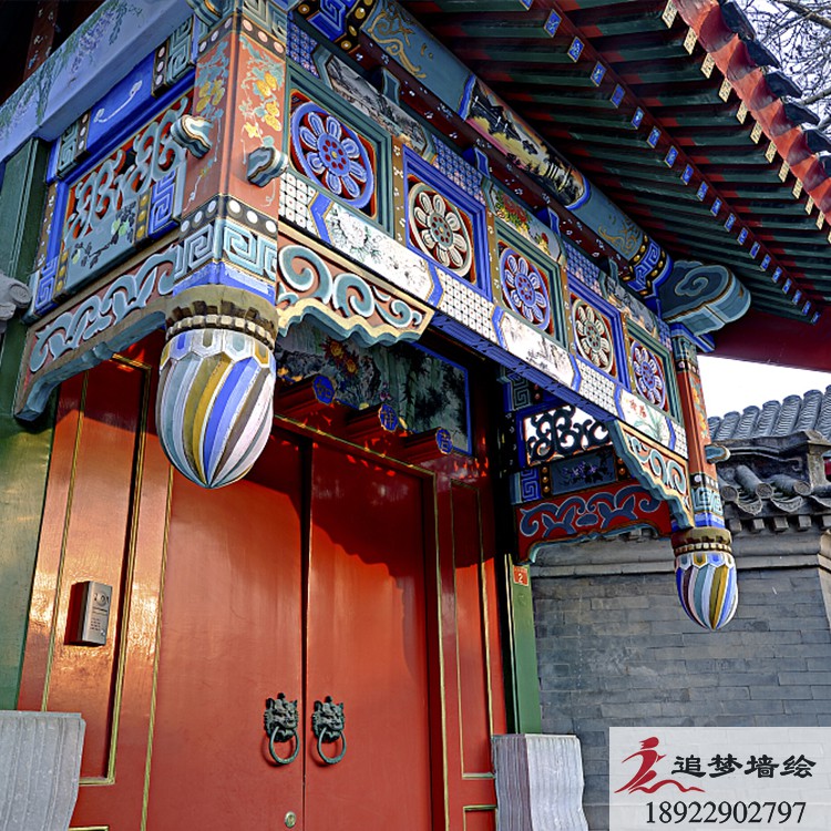墙绘项目介绍: 这个项目的古建筑彩绘是根据岭南文化进行彩绘图案设计。是由苏式、旋子、和玺彩画融合而成的彩绘效果与其他古建筑彩绘风格大致一致,却体现了当地特色习俗与审美。用丰富色彩把画面做的精彩生动,色调明快,协调统一,具有地方特色。