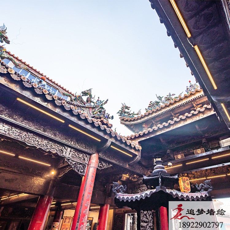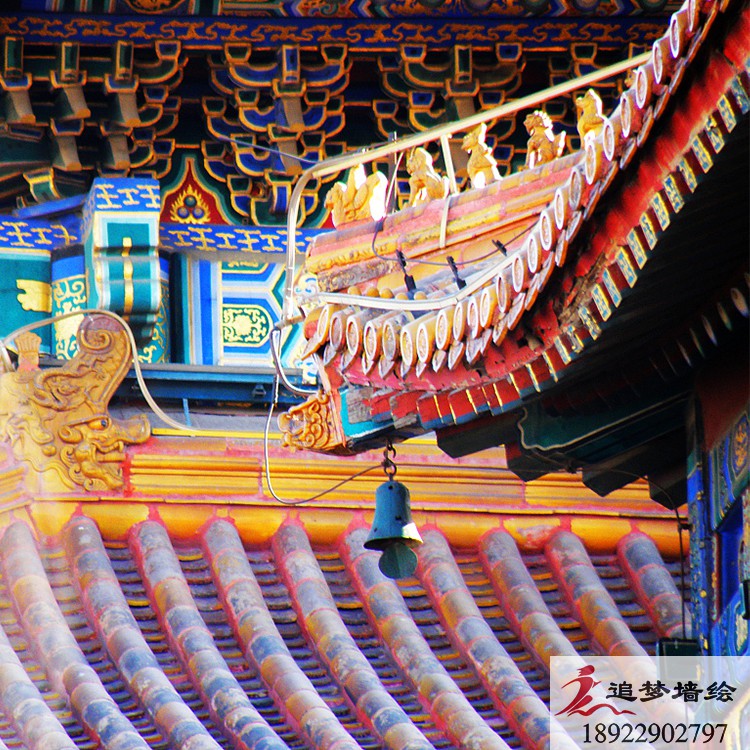 墙绘项目介绍: 这个项目的古建筑彩绘是根据岭南文化进行彩绘图案设计。是由苏式、旋子、和玺彩画融合而成的彩绘效果与其他古建筑彩绘风格大致一致,却体现了当地特色习俗与审美。用丰富色彩把画面做的精彩生动,色调明快,协调统一,具有地方特色。