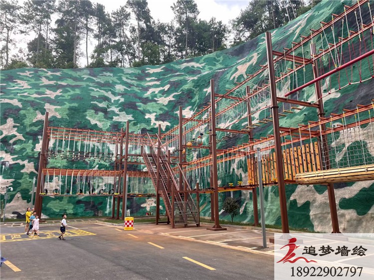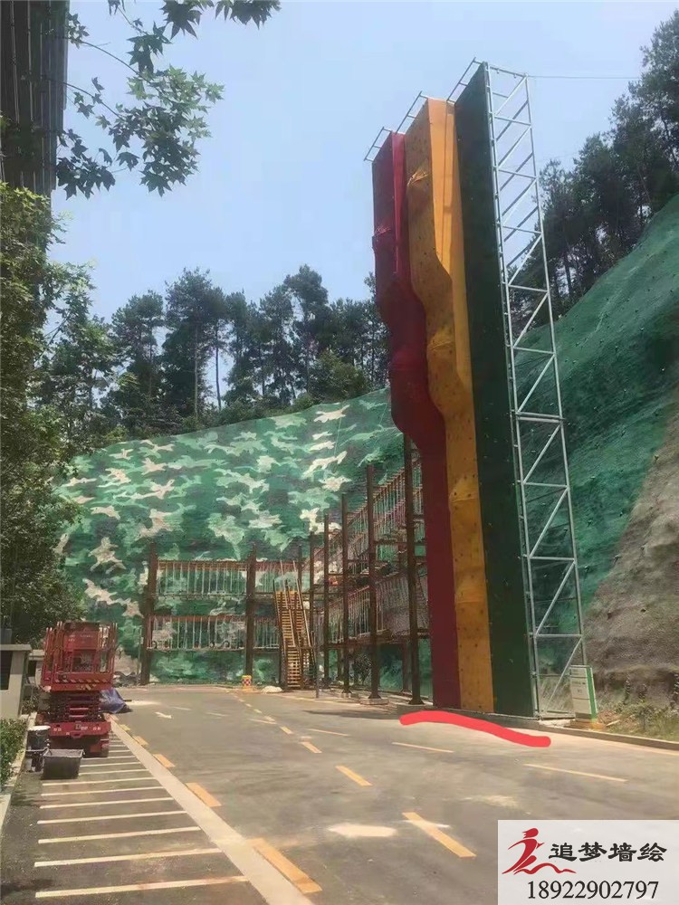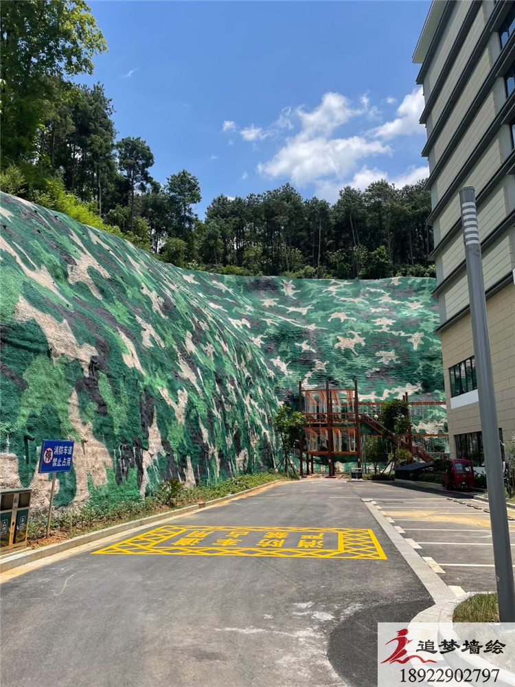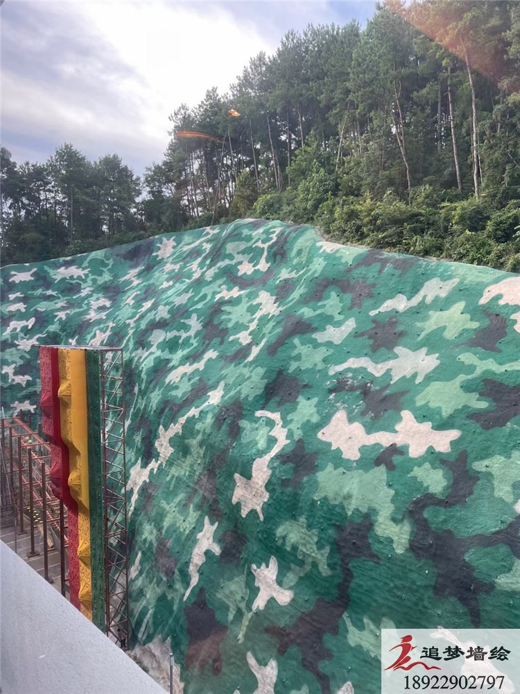 墙绘项目介绍:教育训练场,整体设计为大面积的迷彩块风格。表现了军训状态下的气氛。