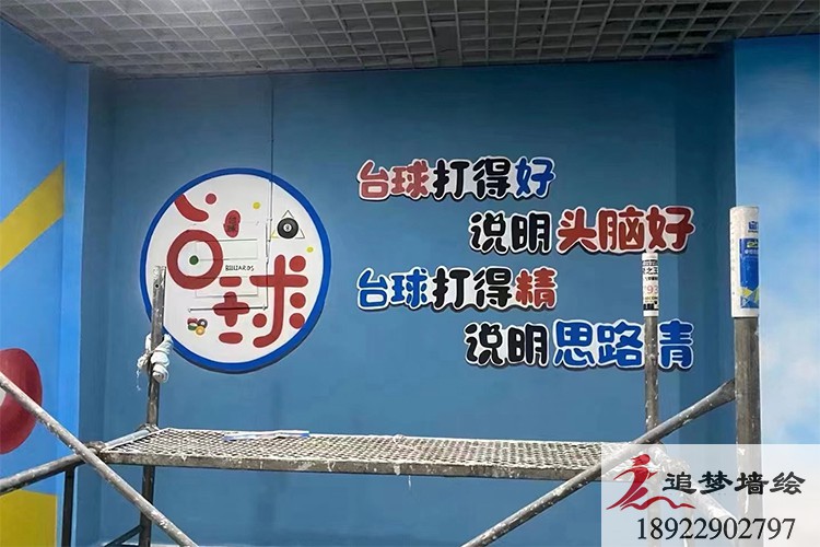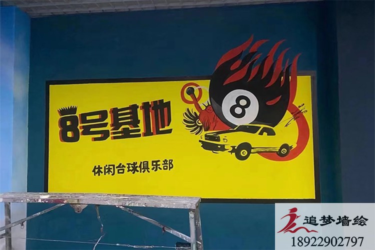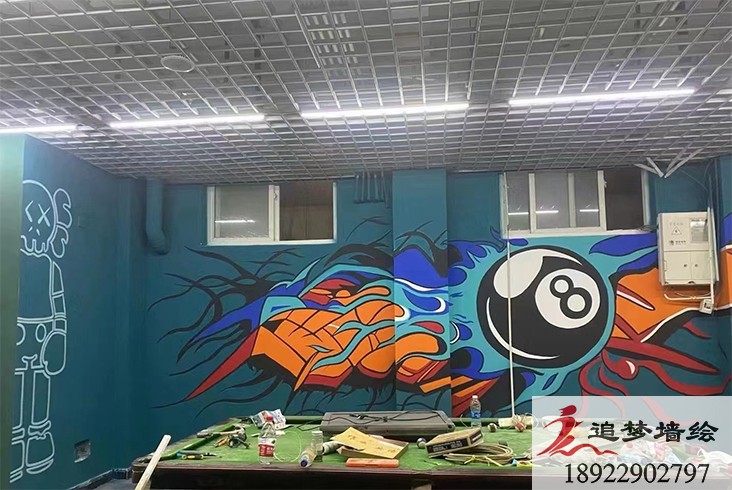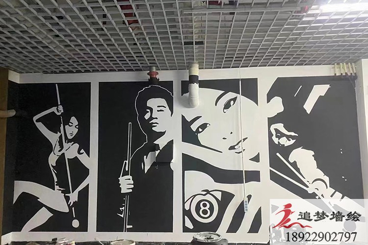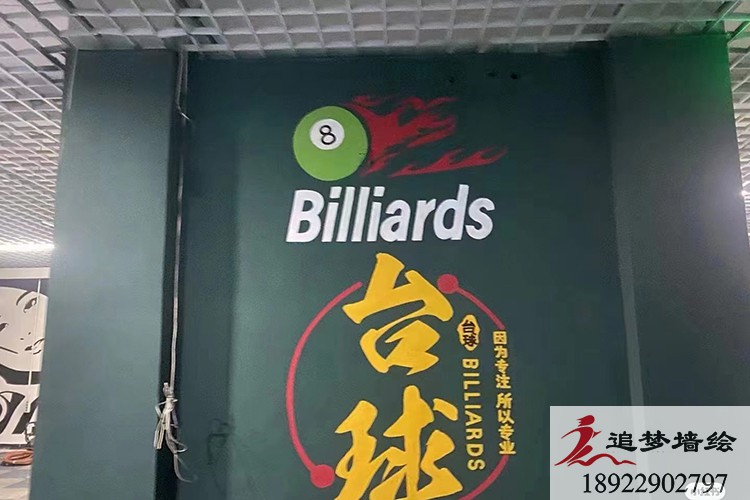 这个墙绘项目的名称是东莞八号台球基地,主要内容是给一个正在装修的台球馆创作一个以台球为主题类型的墙绘彩绘作品,这一系列的墙绘作品包含了很多跟台球相关的元素,用墙绘的形式制作与台球相关的作品能很好的体现了这个台球馆有属于自己的风格,更能吸引到客人的注意,所以说,好的墙绘作品无论哪里都能起到一个画龙点睛的作用。